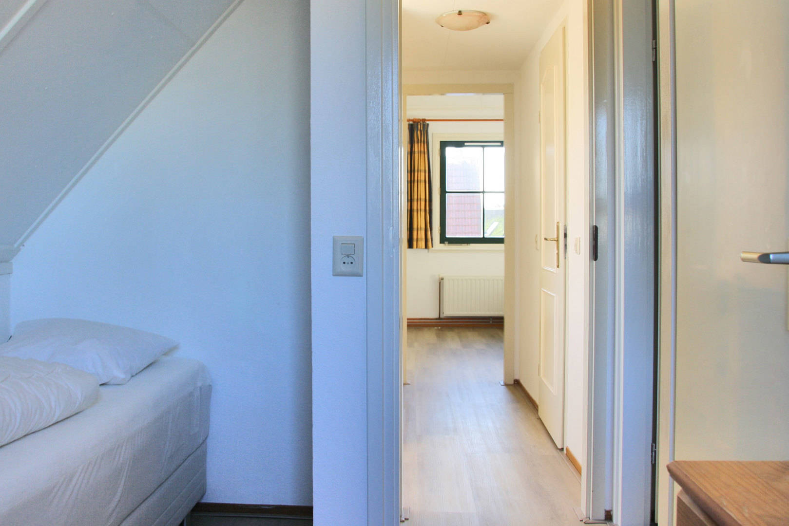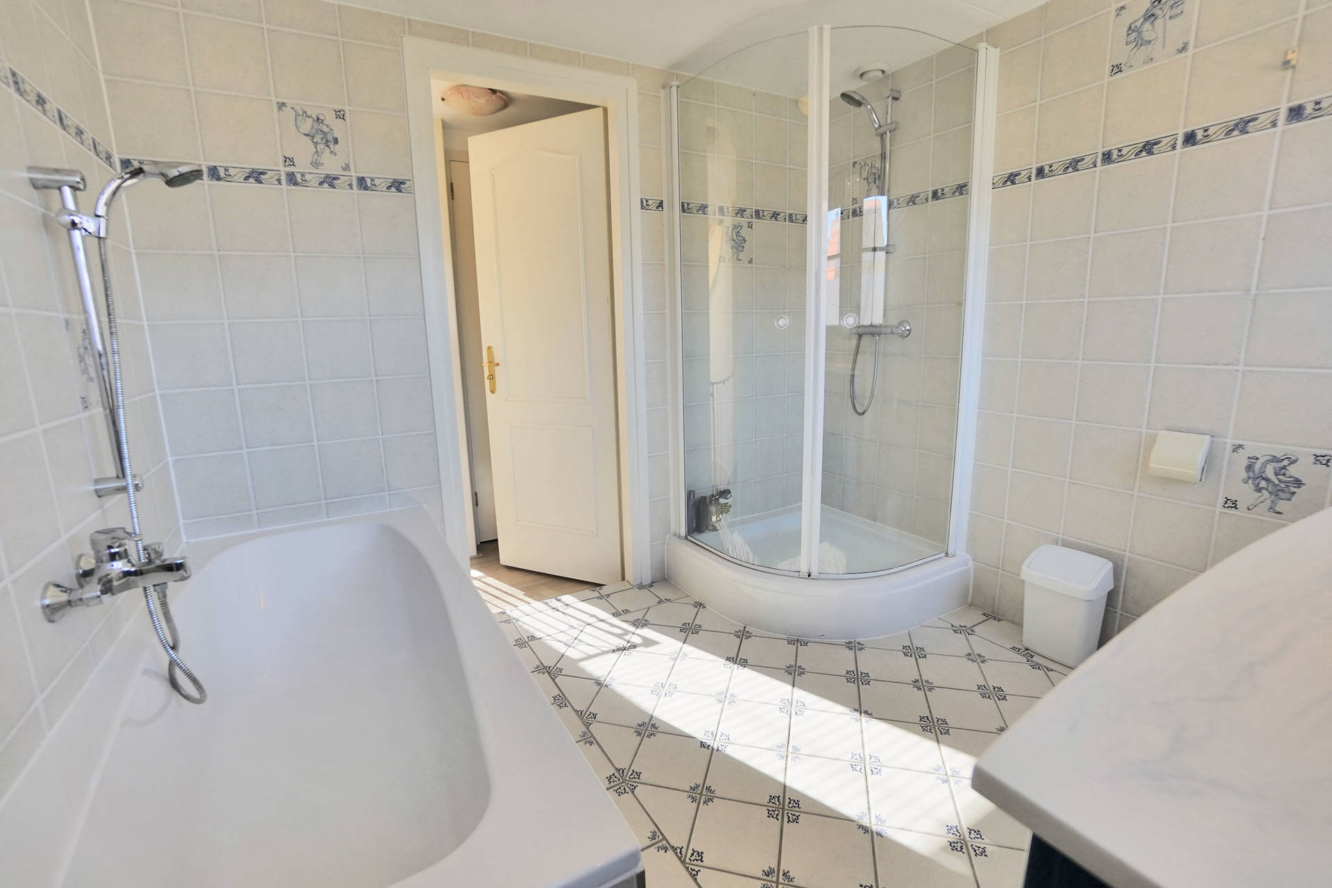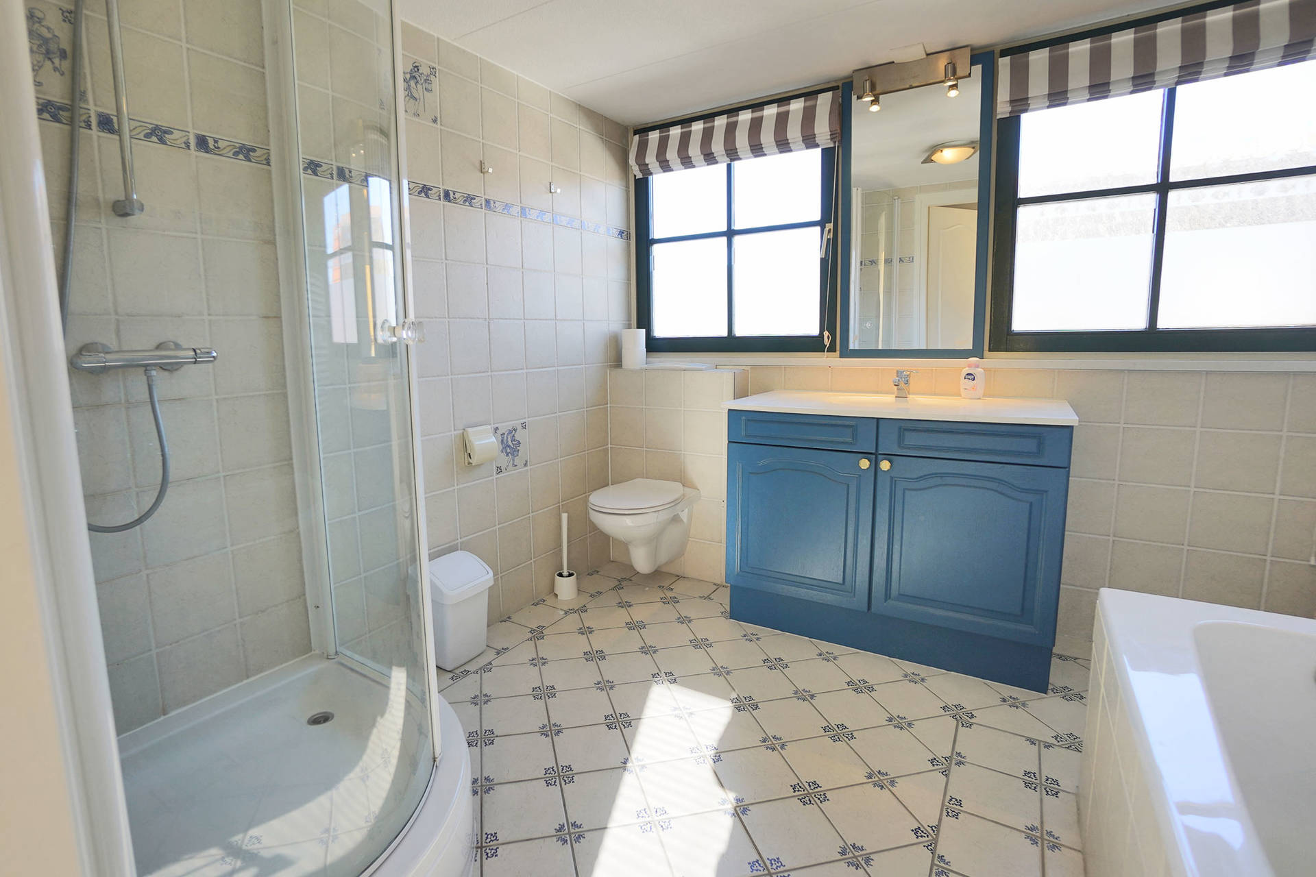 Op de eerste verdieping is de ruime luxe ruime badkamer met ligbad en een aparte douchecabine. Hier is ook een tweede wc en wastafel. Er zijn 3 slaapkamers. Twee slaapkamers met elk twee eenpersoonsbedden en een slaapkamer met een tweepersoonsbed.