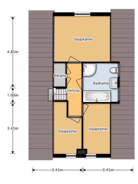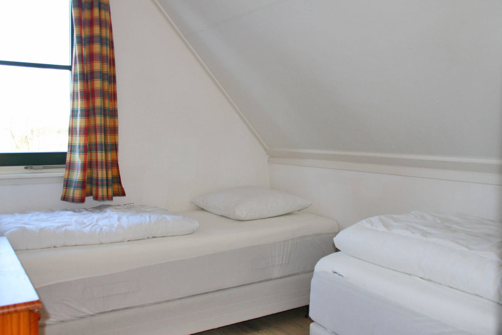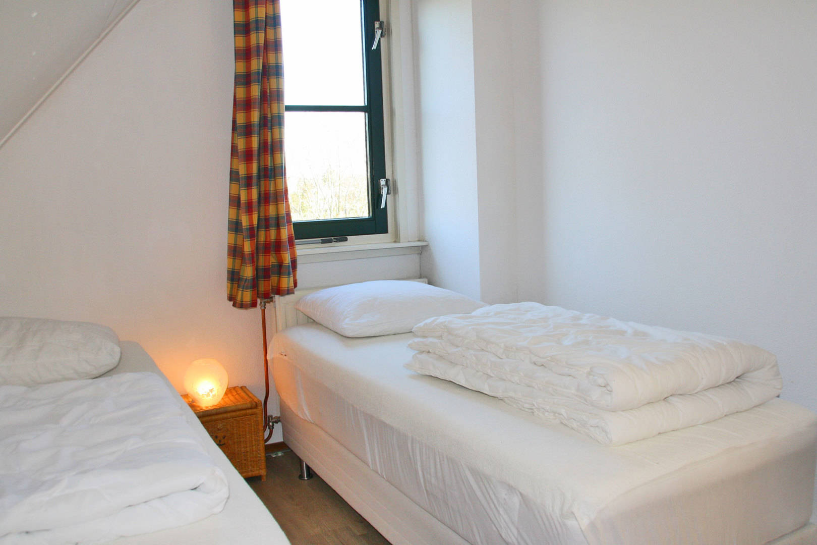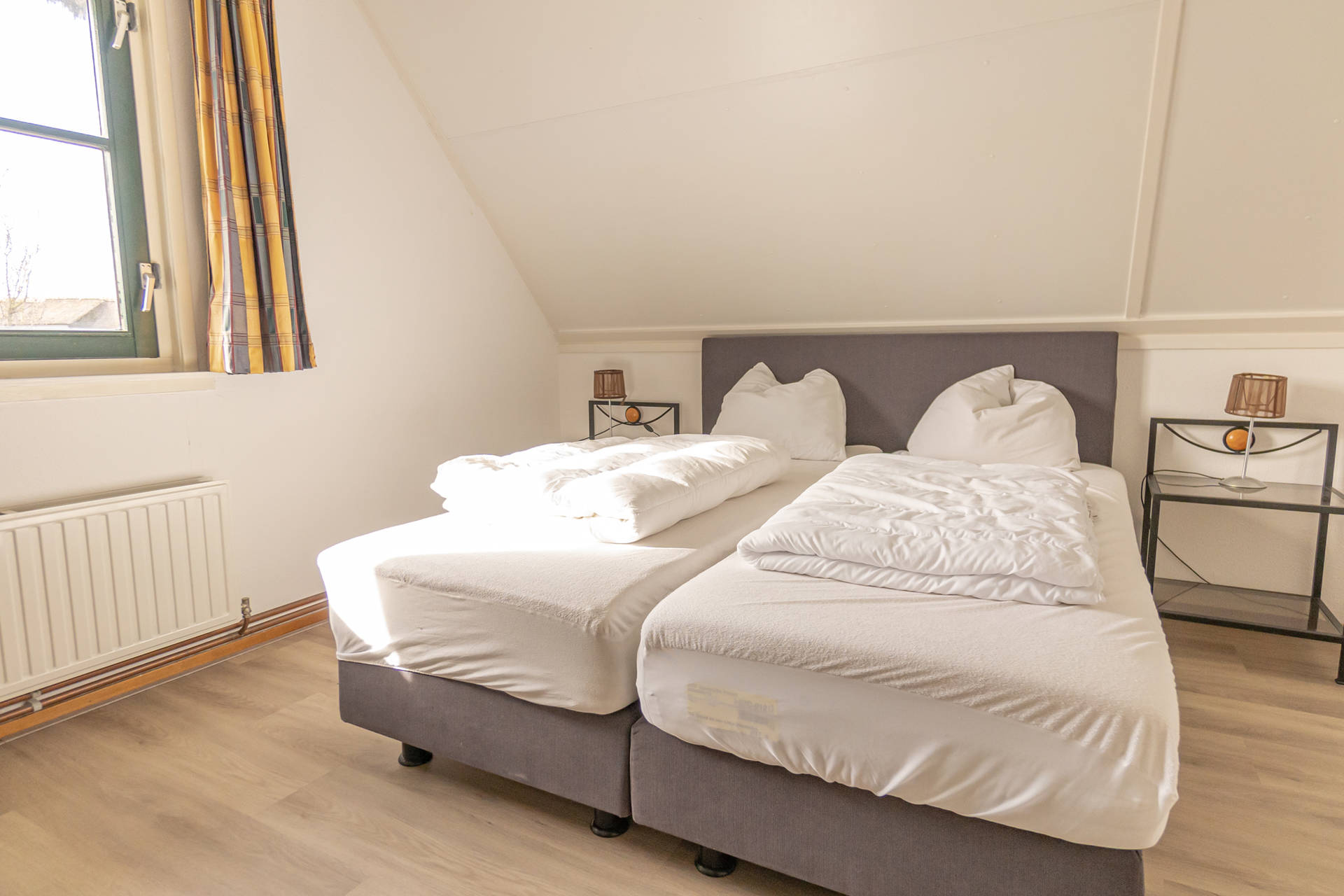 Op de eerste verdieping is de ruime luxe ruime badkamer met ligbad en een aparte douchecabine. Hier is ook een tweede wc en wastafel. Er zijn 3 slaapkamers. Twee slaapkamers met elk twee eenpersoonsbedden en een slaapkamer met een tweepersoonsbed.
