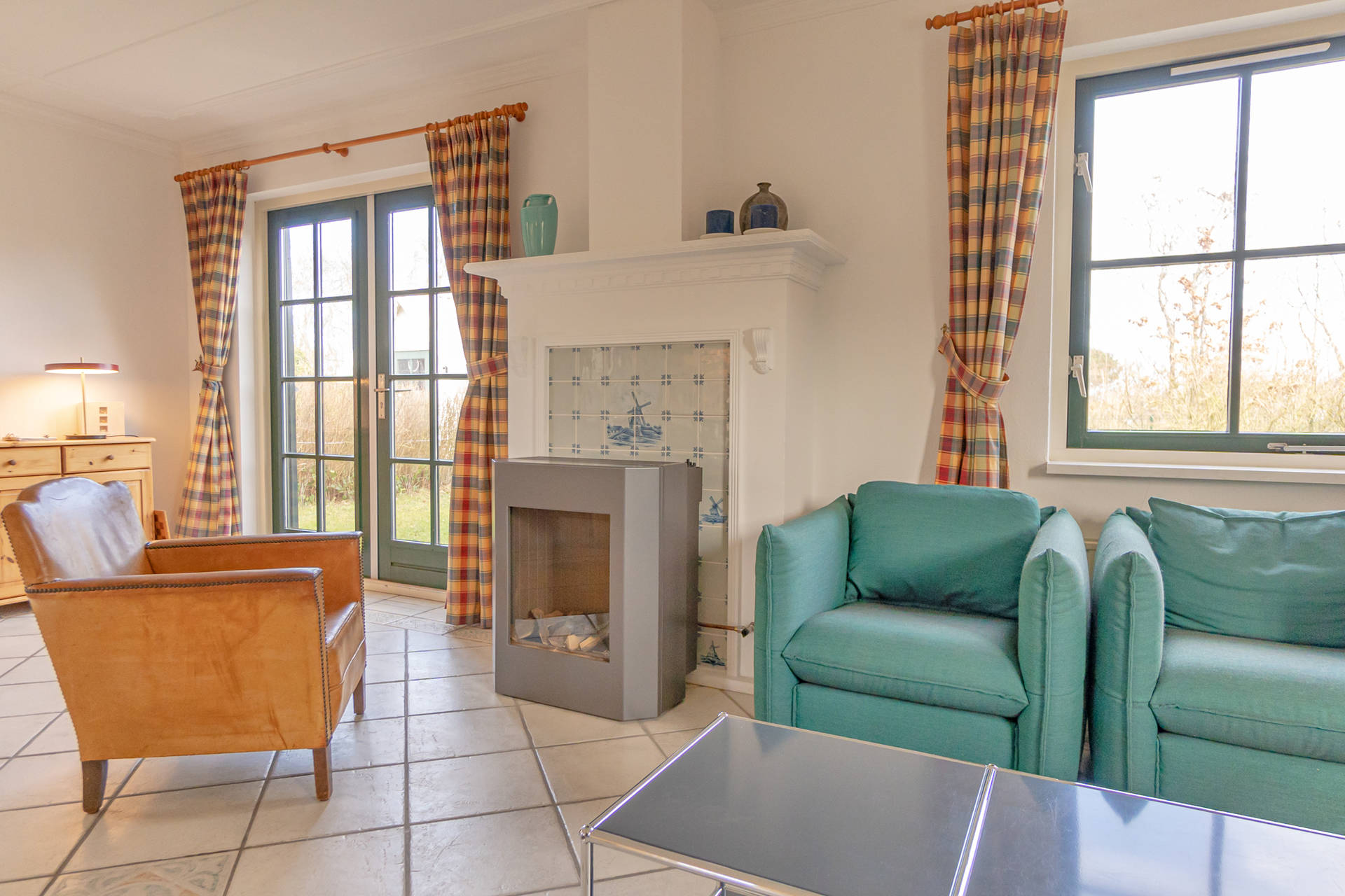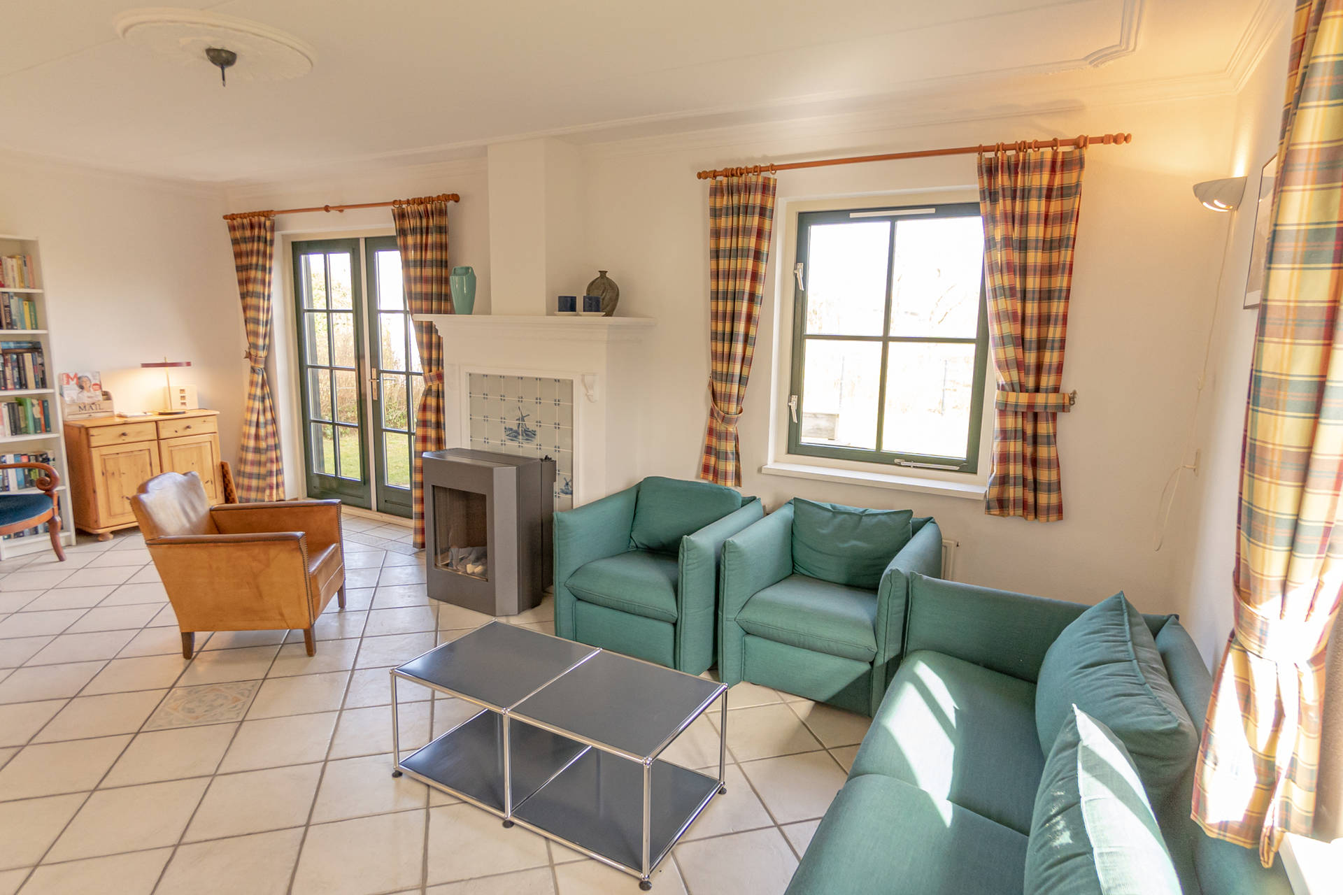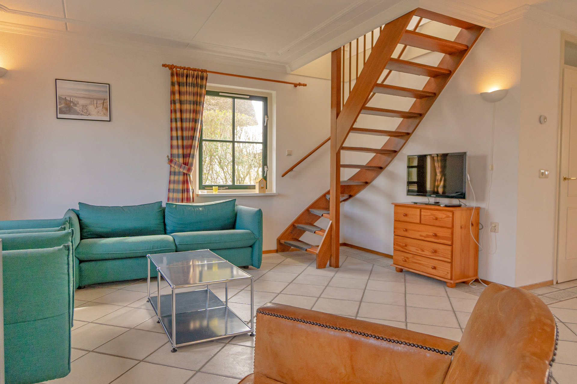De zonnige woonkamer heeft 2 comfortabele banken. Via openslaande deuren in de woonkamer kan de heerlijke afgesloten tuin met terras bereikt worden. Hier kunt u heerlijk rustig en privé van de zon genieten. De tuin is geheel omzoomd en biedt veel beschutting tegen eventuele wind, u kunt hier dus al snel buiten zitten en het huis en tuin zijn hiermee ook erg geschikt om met kinderen of huisdier op vakantie te gaan.Het huis heeft een toilet in de hal op de begane grond.