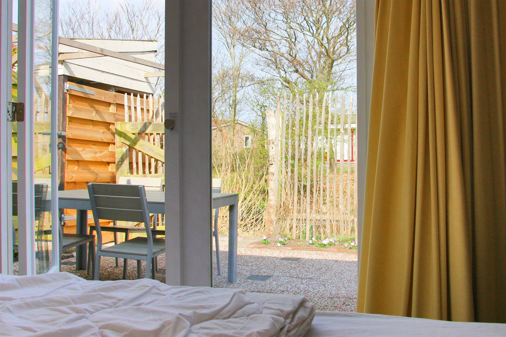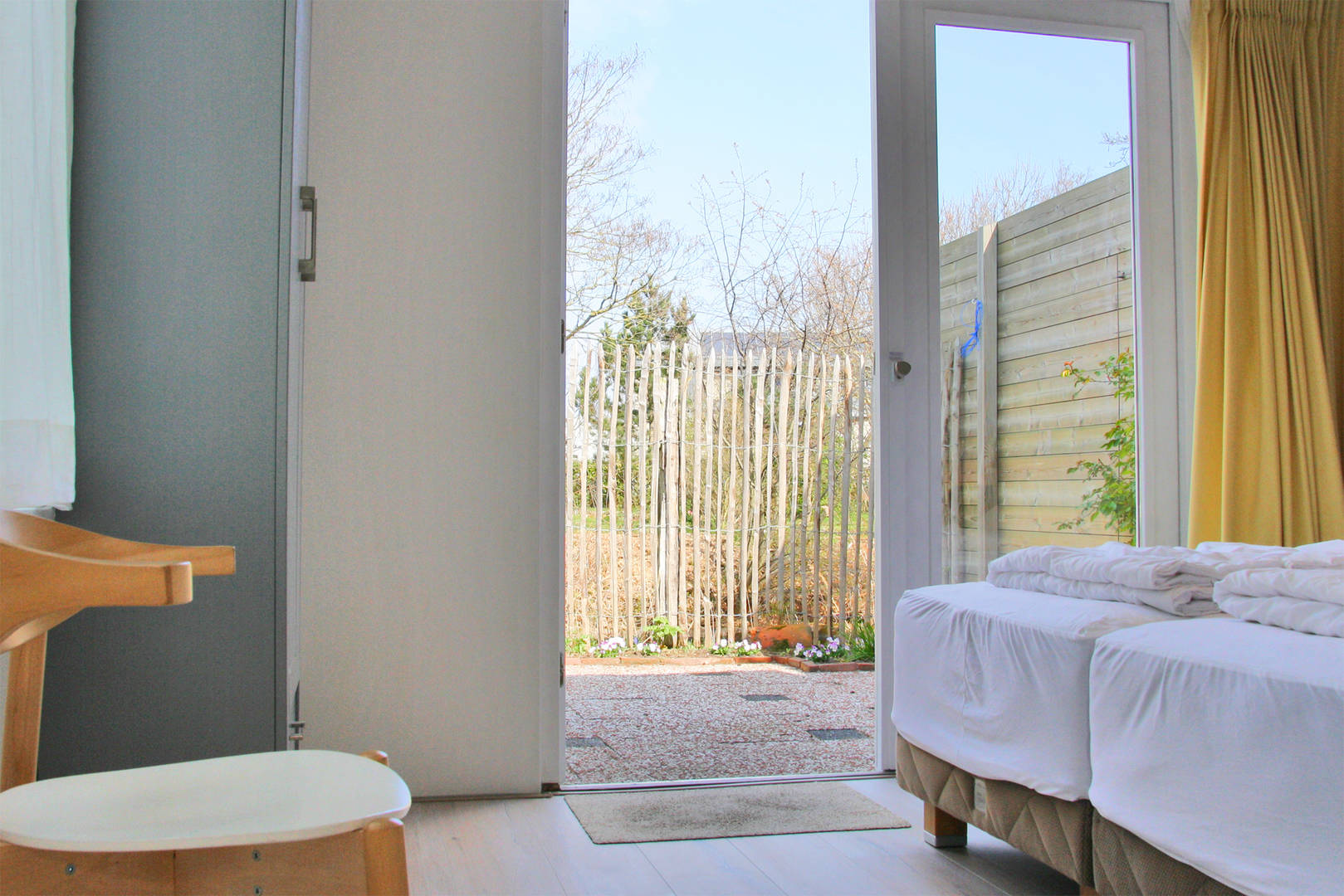 Er is een kleine eethoek en woonkamer met bankstel. Aan de achterkant bevindt zich de slaapkamer met badkamer en suite. De slaapkamer geeft ook toegang tot het tuintje met terras.