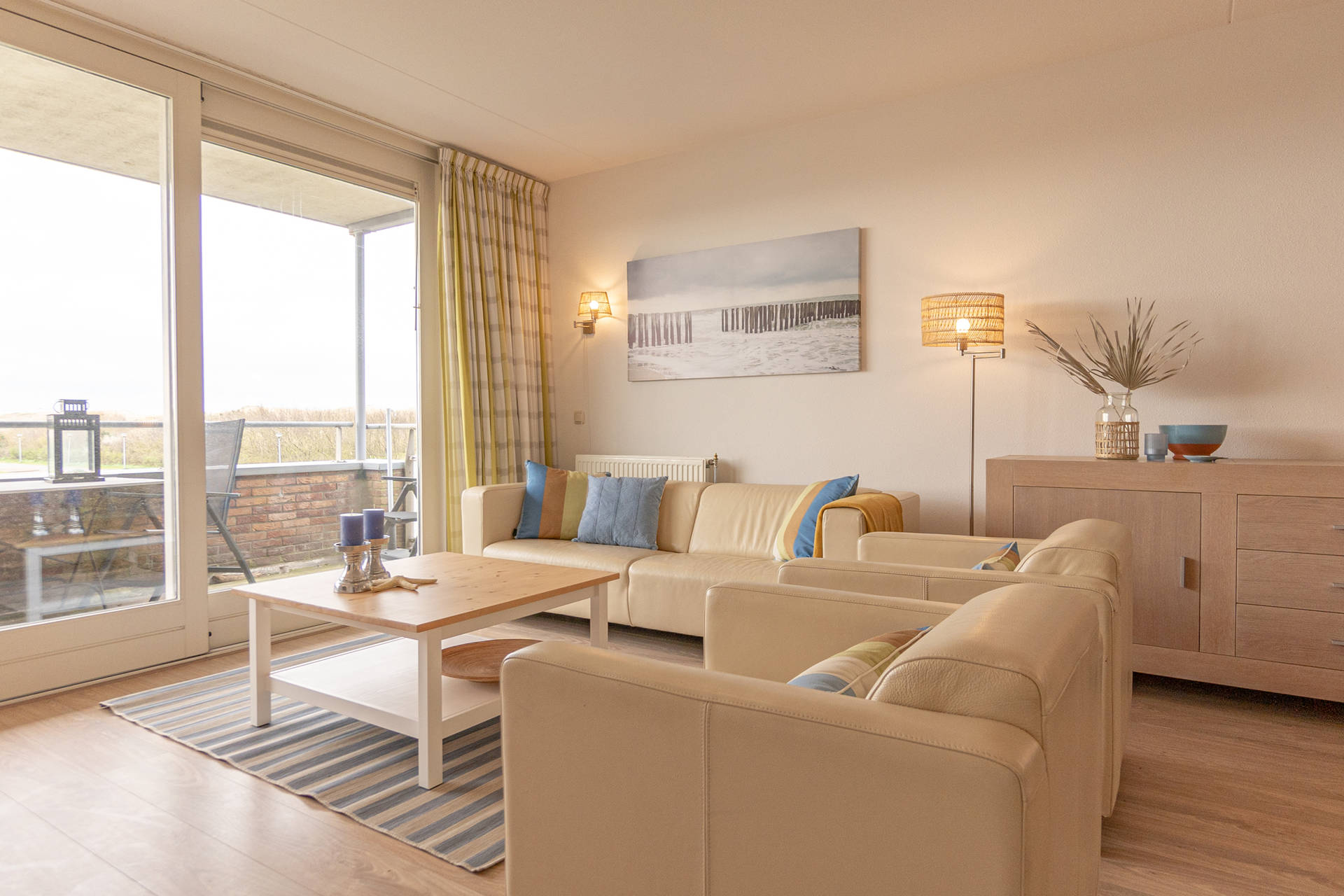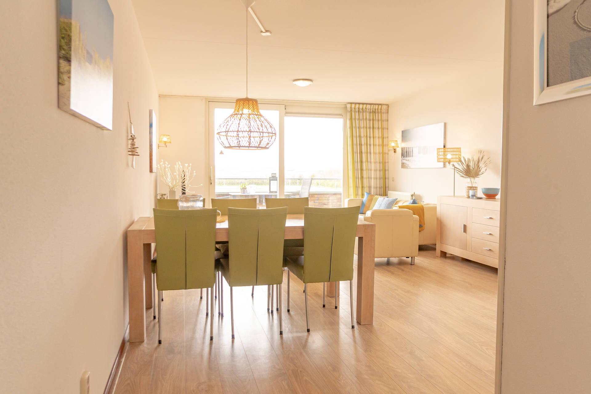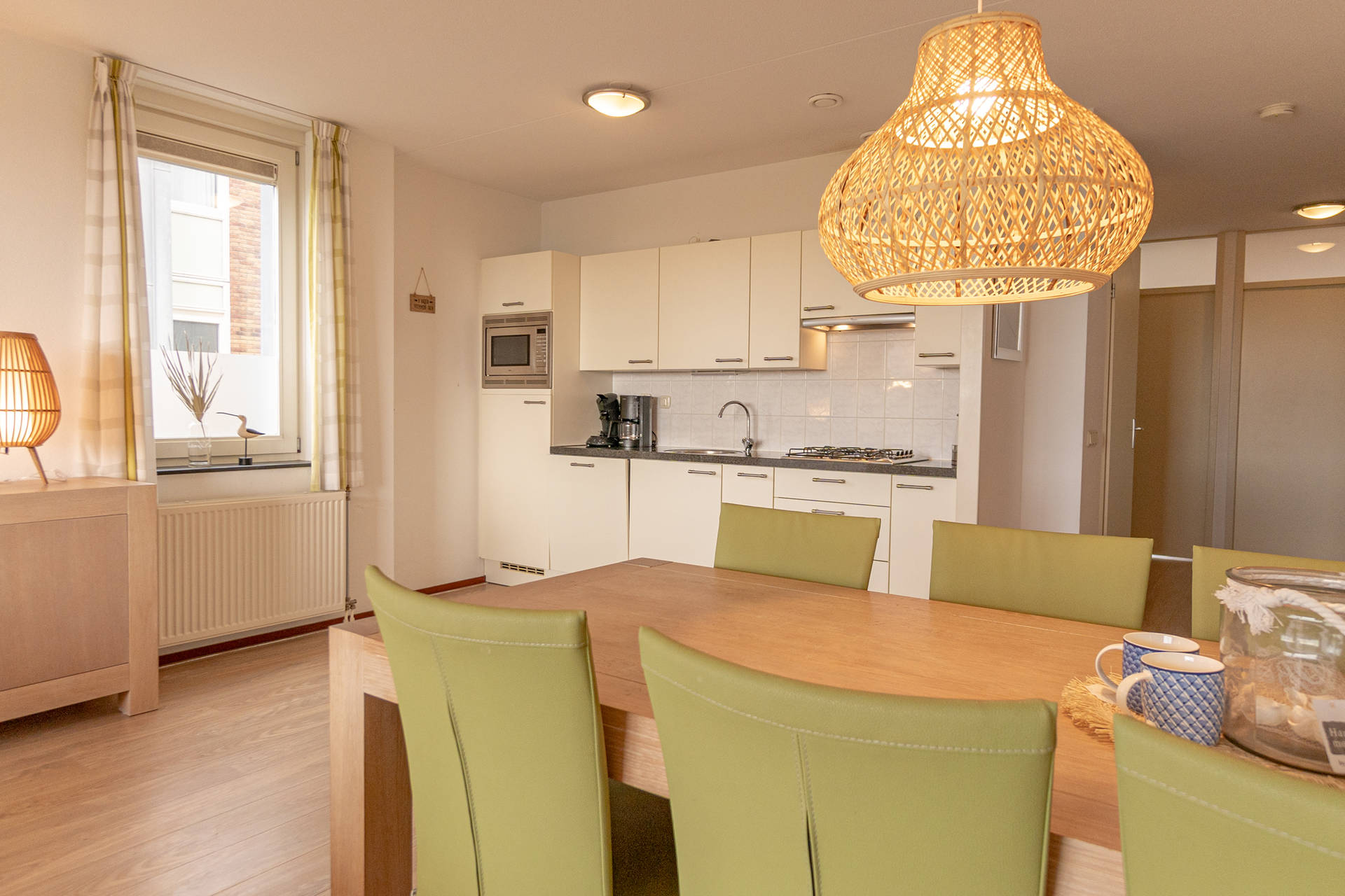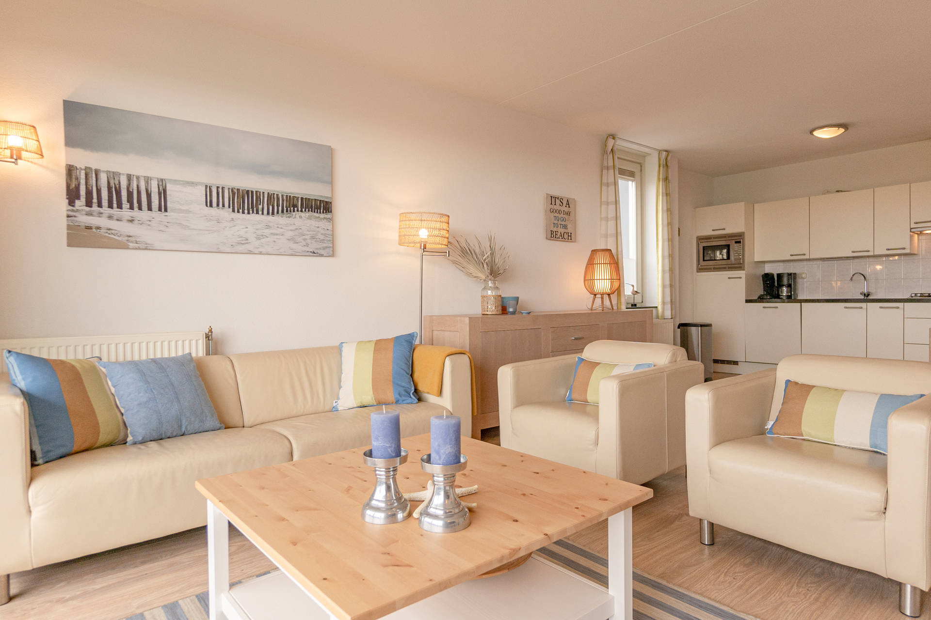 De moderne en ruime vakantiewoning is gelegen op de eerste etage, die je met de trap en lift kunt bereiken. De ruime woonkamer met open keuken is op het zuiden gelegen en via een schuifpui is het balkon te bereiken. Er is een comfortabele zithoek, een eethoek en een open keuken.