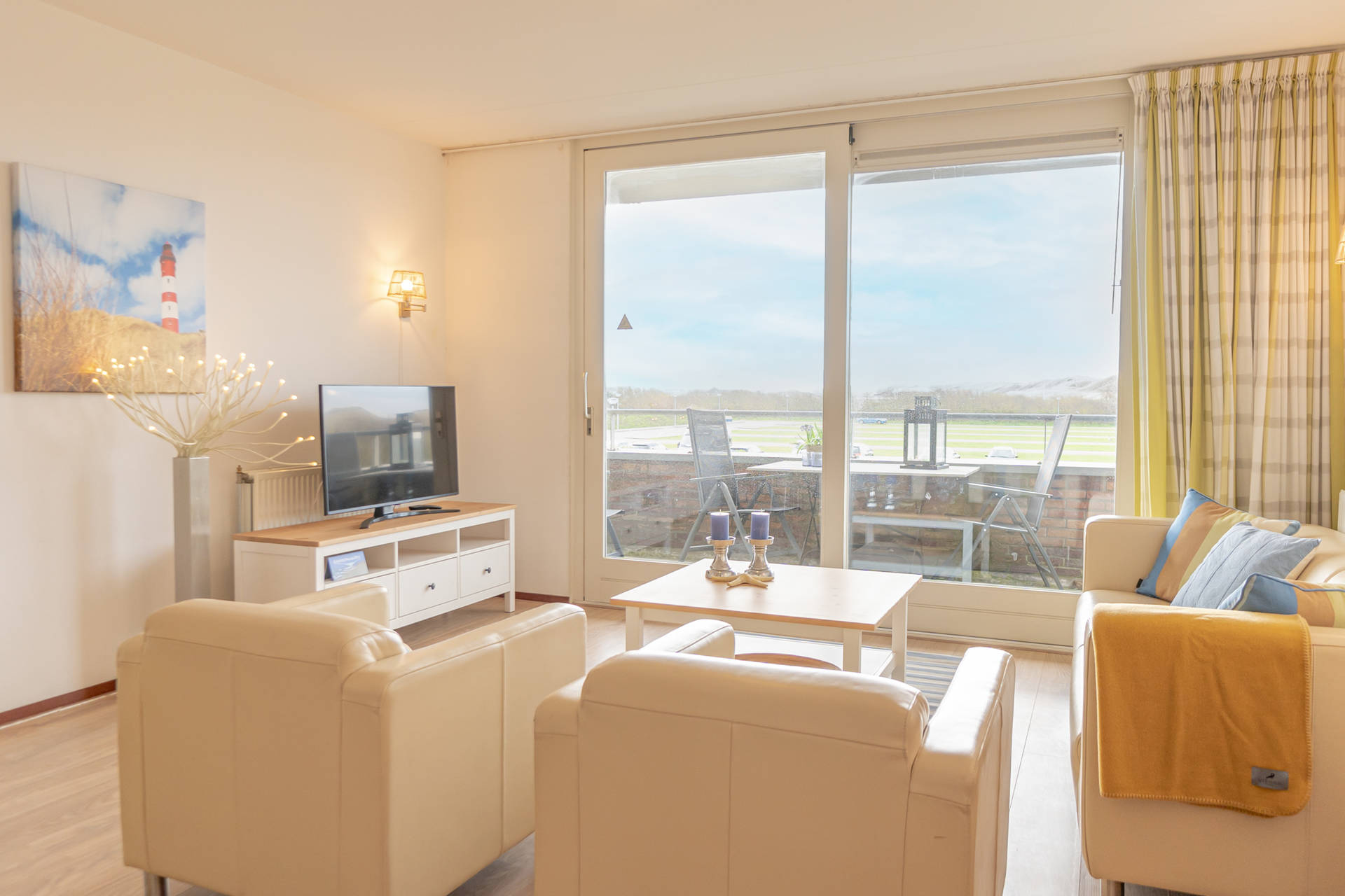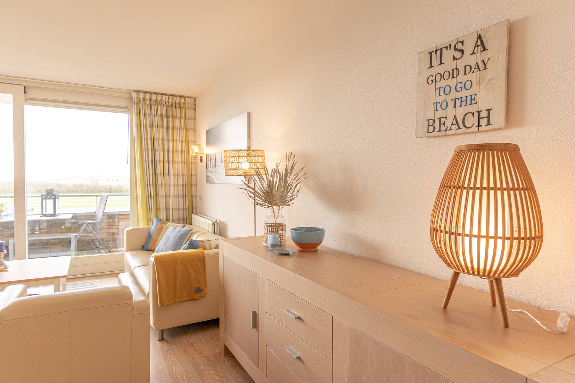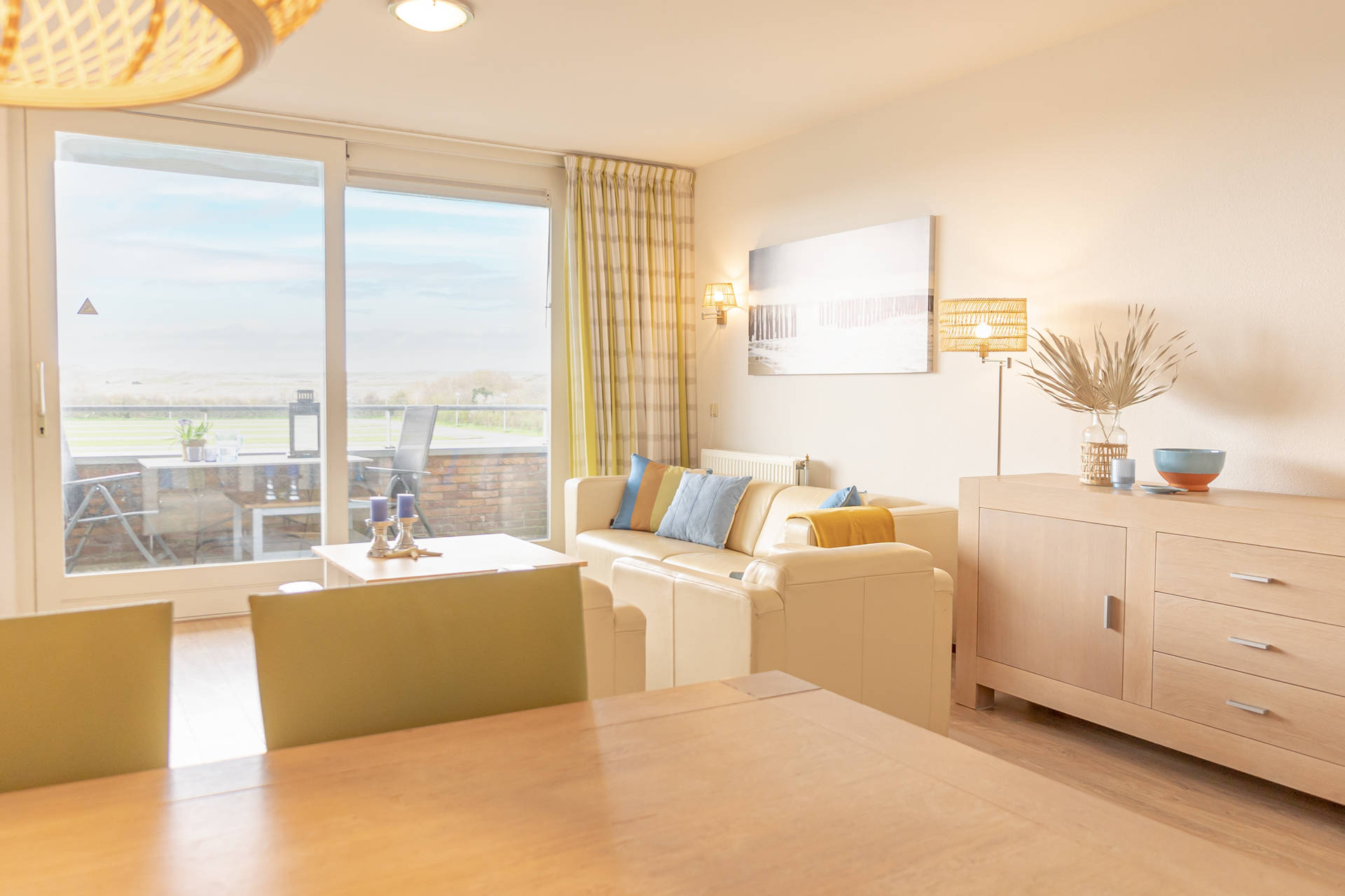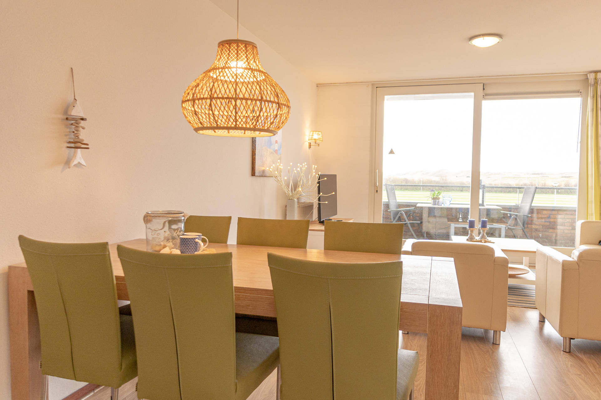 De moderne en ruime vakantiewoning is gelegen op de eerste etage, die je met de trap en lift kunt bereiken. De ruime woonkamer met open keuken is op het zuiden gelegen en via een schuifpui is het balkon te bereiken. Er is een comfortabele zithoek, een eethoek en een open keuken.
