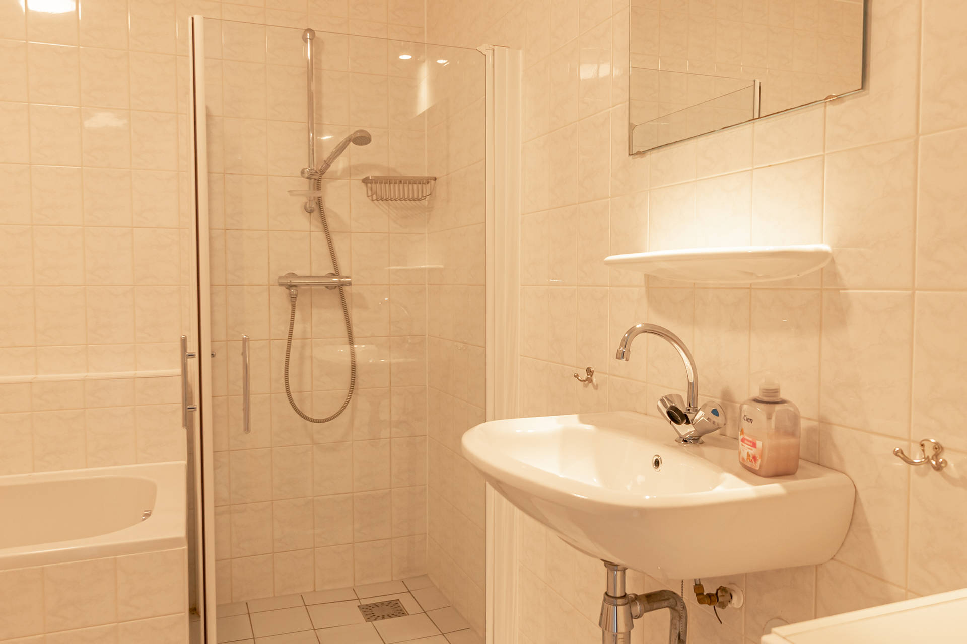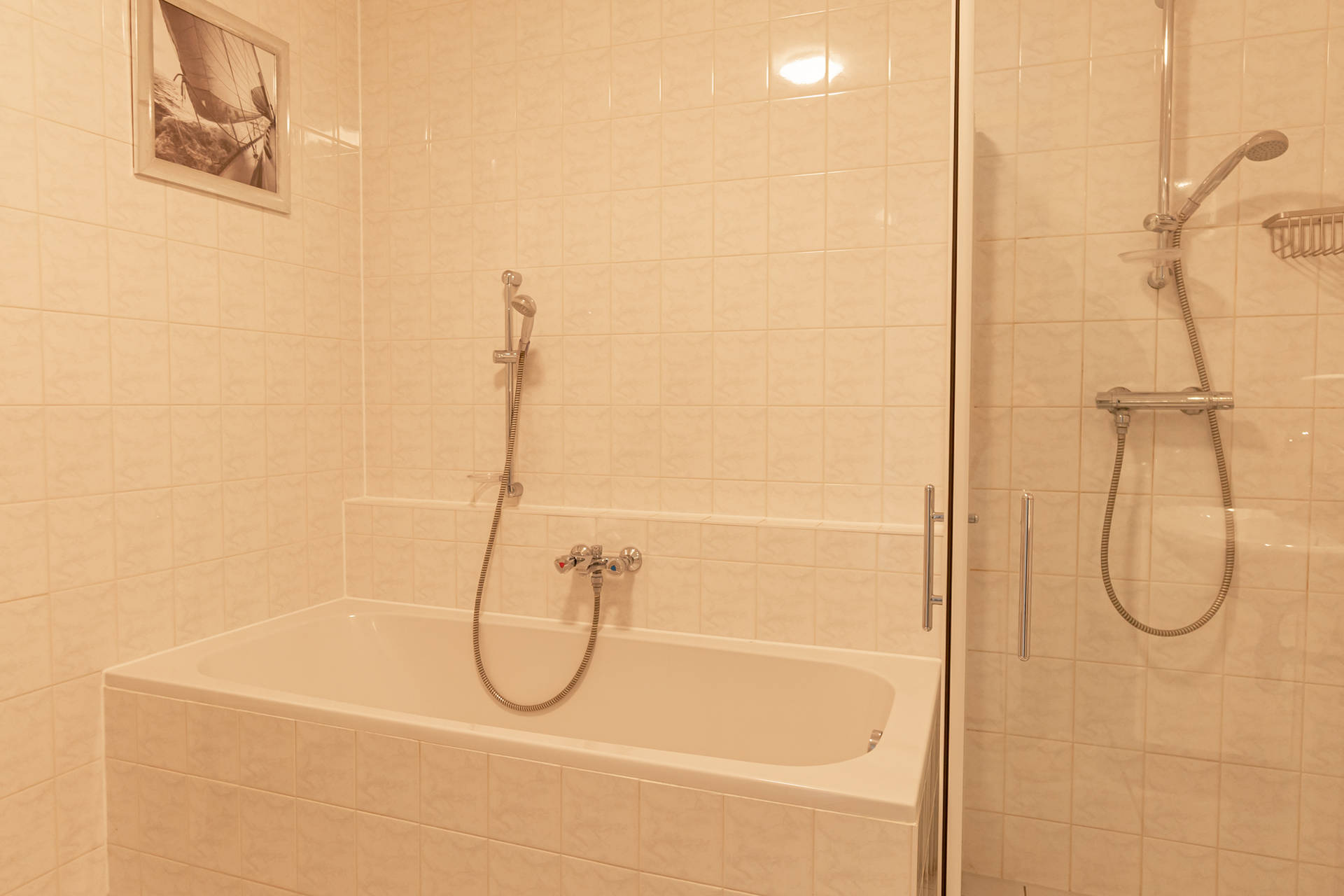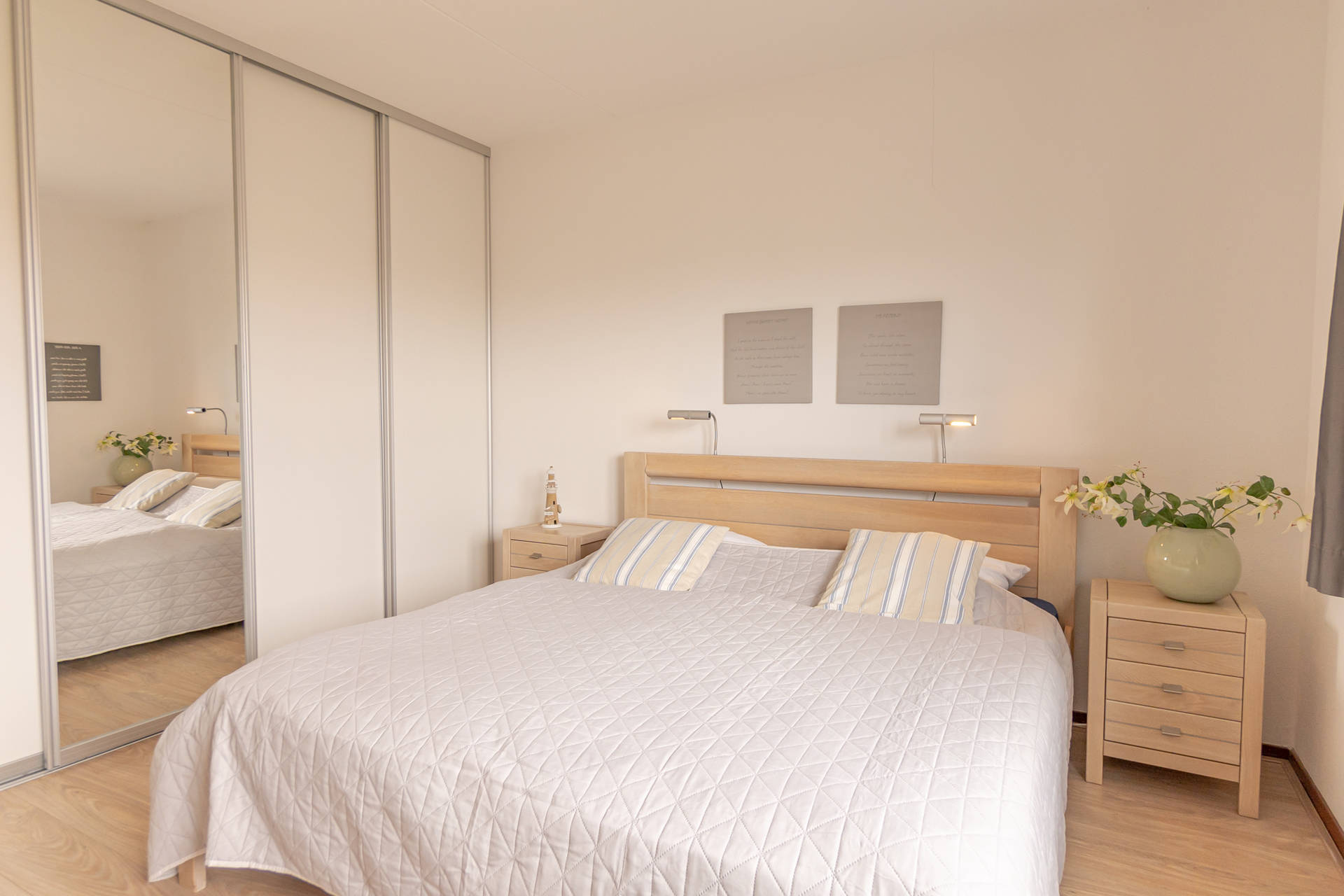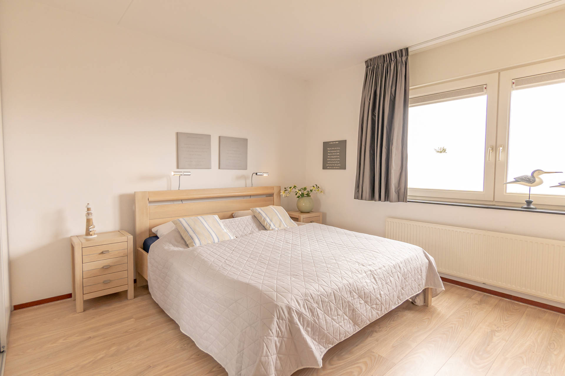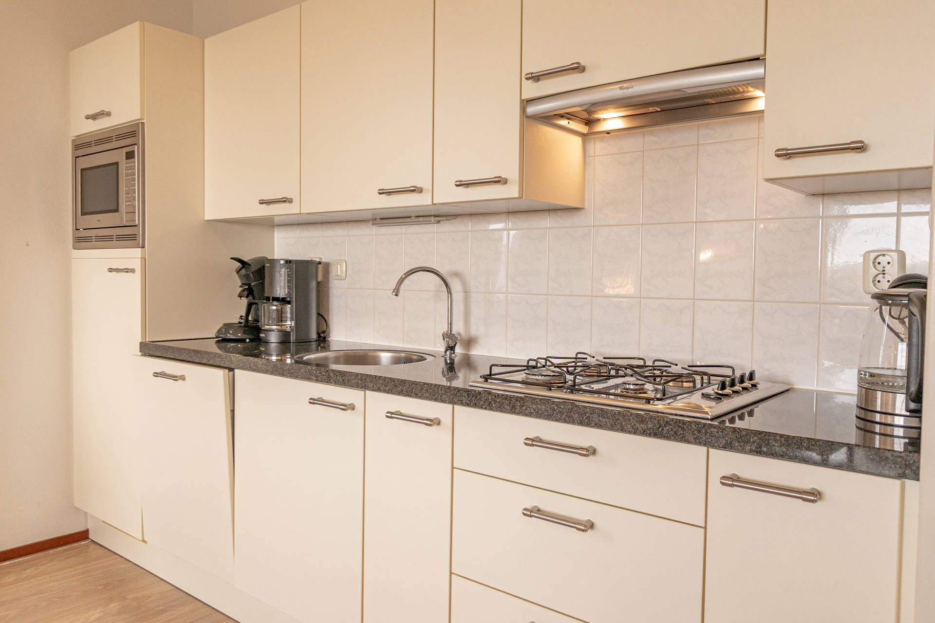 De open keuken is van alle gemakken voorzien met oa. vaatwasser, oven, koelkast met vriesvak en senseo. De woning van circa 90 m2 heeft 2 slaapkamers, een met een twee-persoonsbed en een slaapkamer met twee een-persoonsbedden. De badkamer heeft een bad en douche. De wc is in de hal.