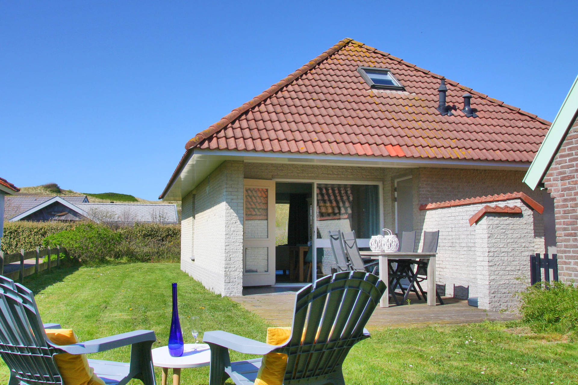 De woning staat op een eigen erf van ca. 320 m2, met een groot grasveld en terras op het zuidwesten. Via een openslaande deur, grenzend aan de open keuken, komt u direct op het terras. Ideaal dus om bijvoorbeeld buiten te eten.