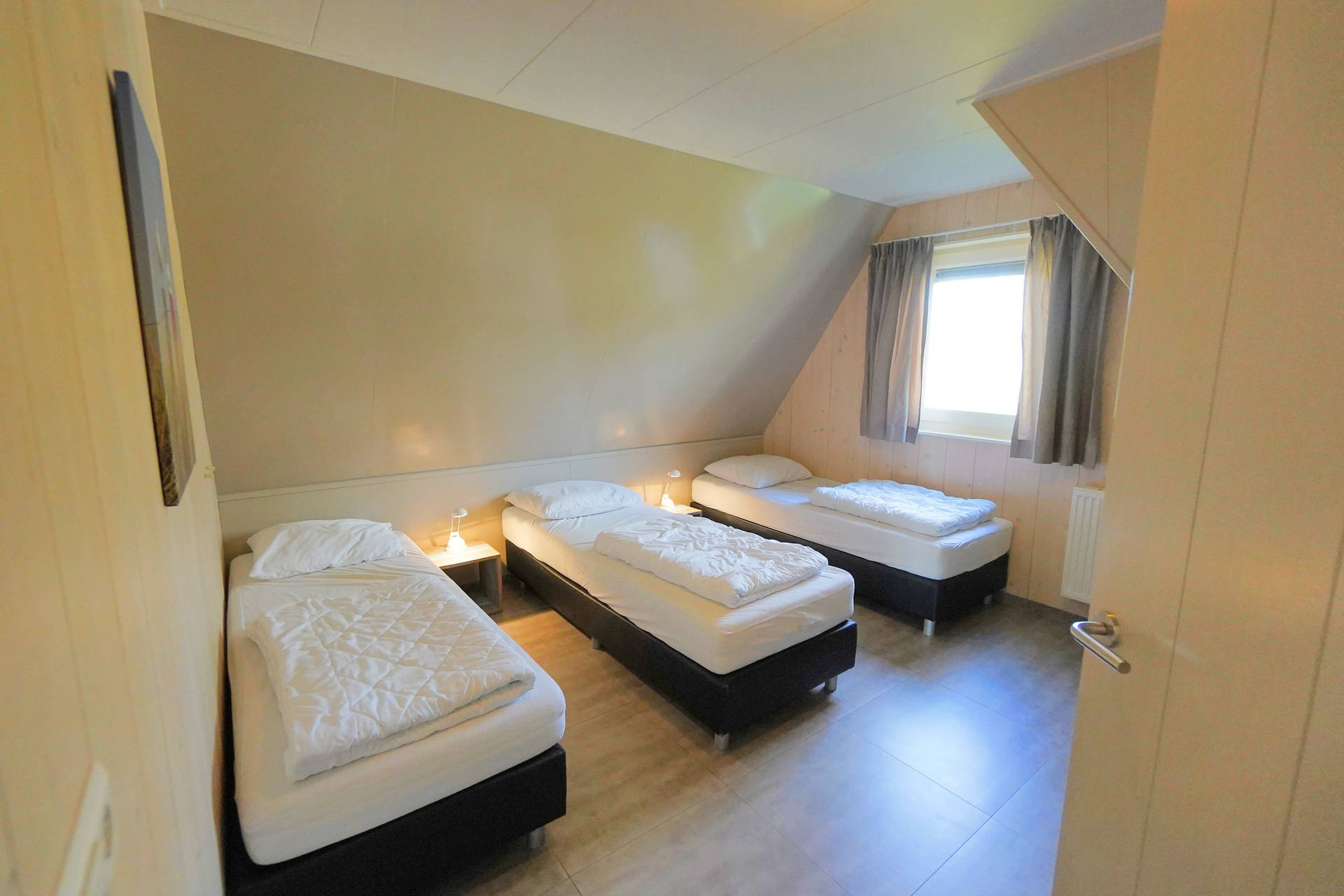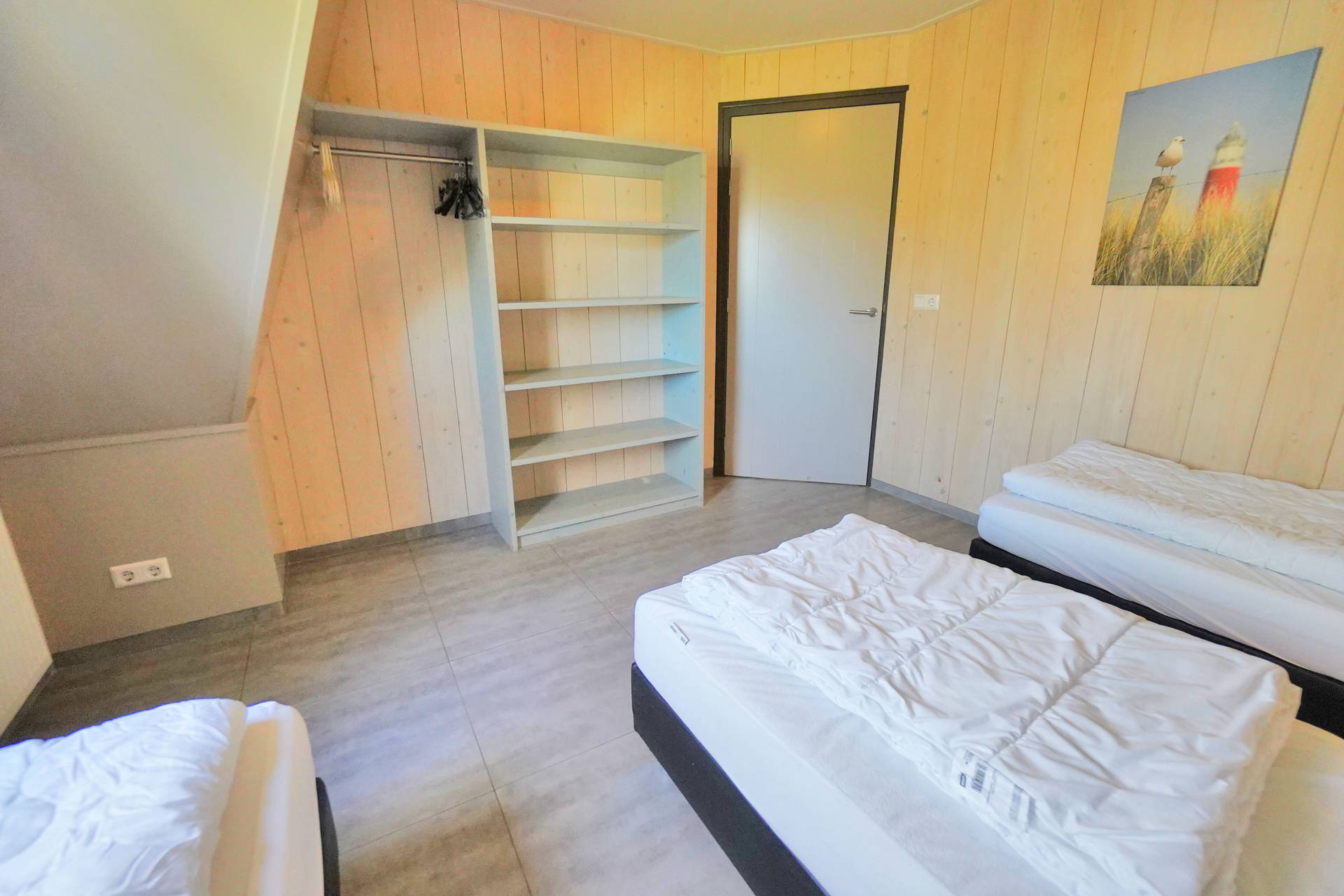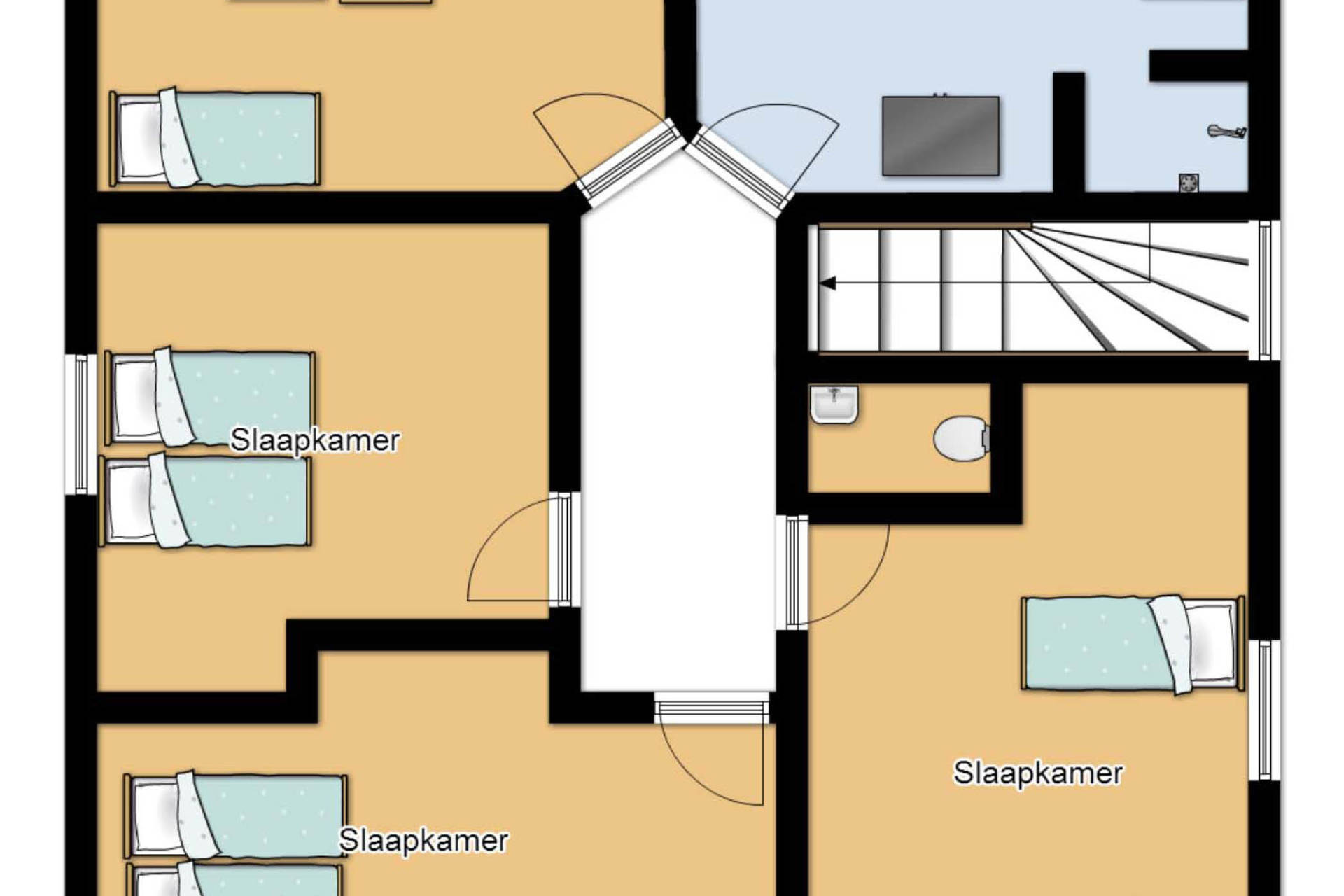 Op de bovenverdieping zijn 4 slaapkamers, een grote badkamer met een ligbad, douche en dubbele wastafel. Tevens is er een aparte toiletruimte. De trap heeft boven een vast traphekje. Alle bedden zijn eenpersoons boxspring bedden.