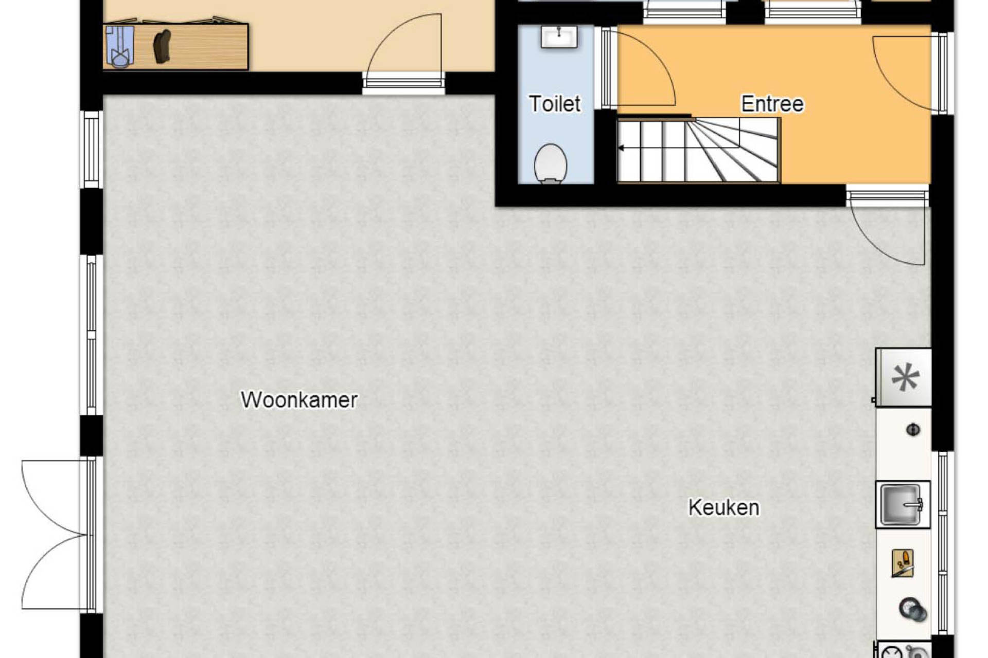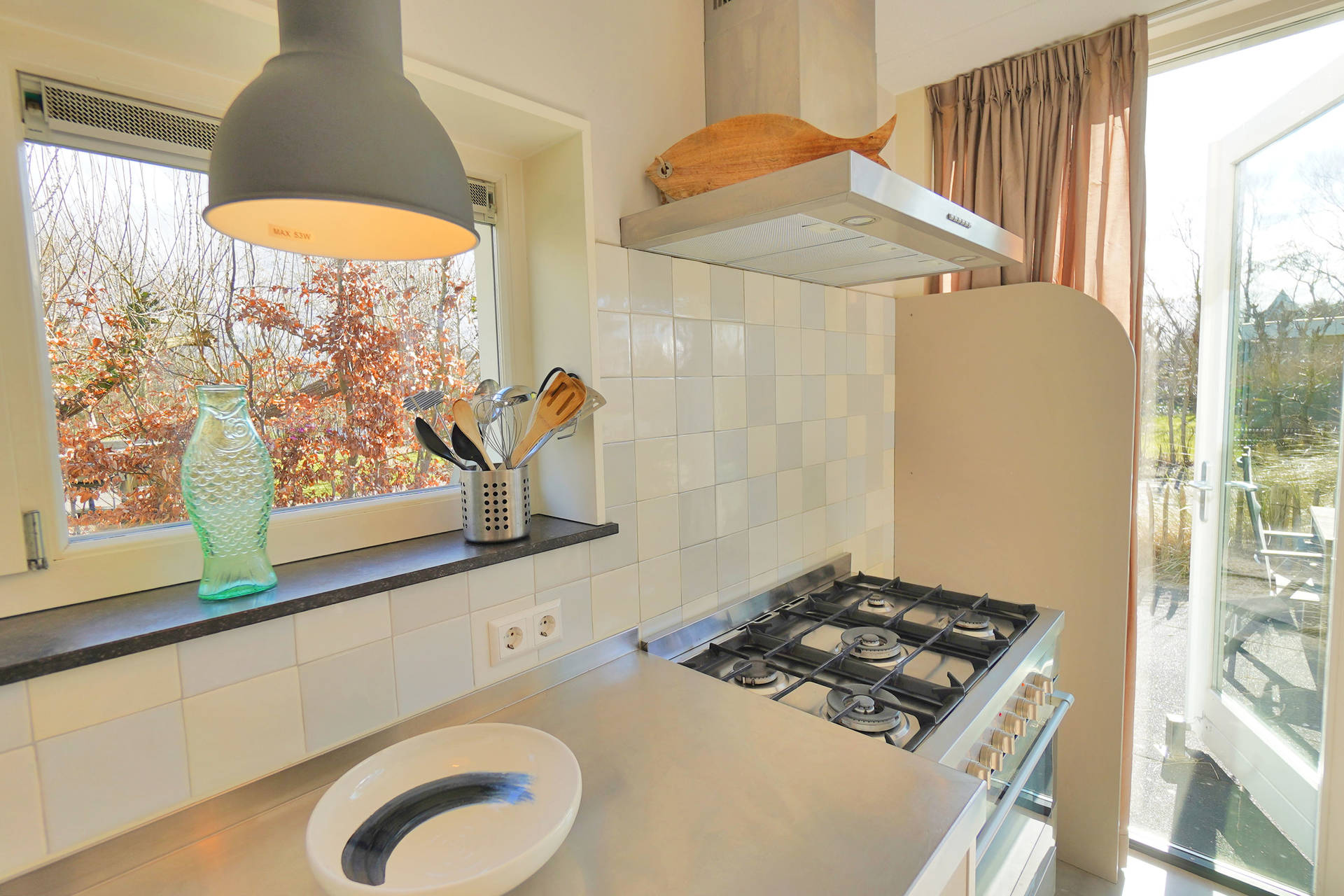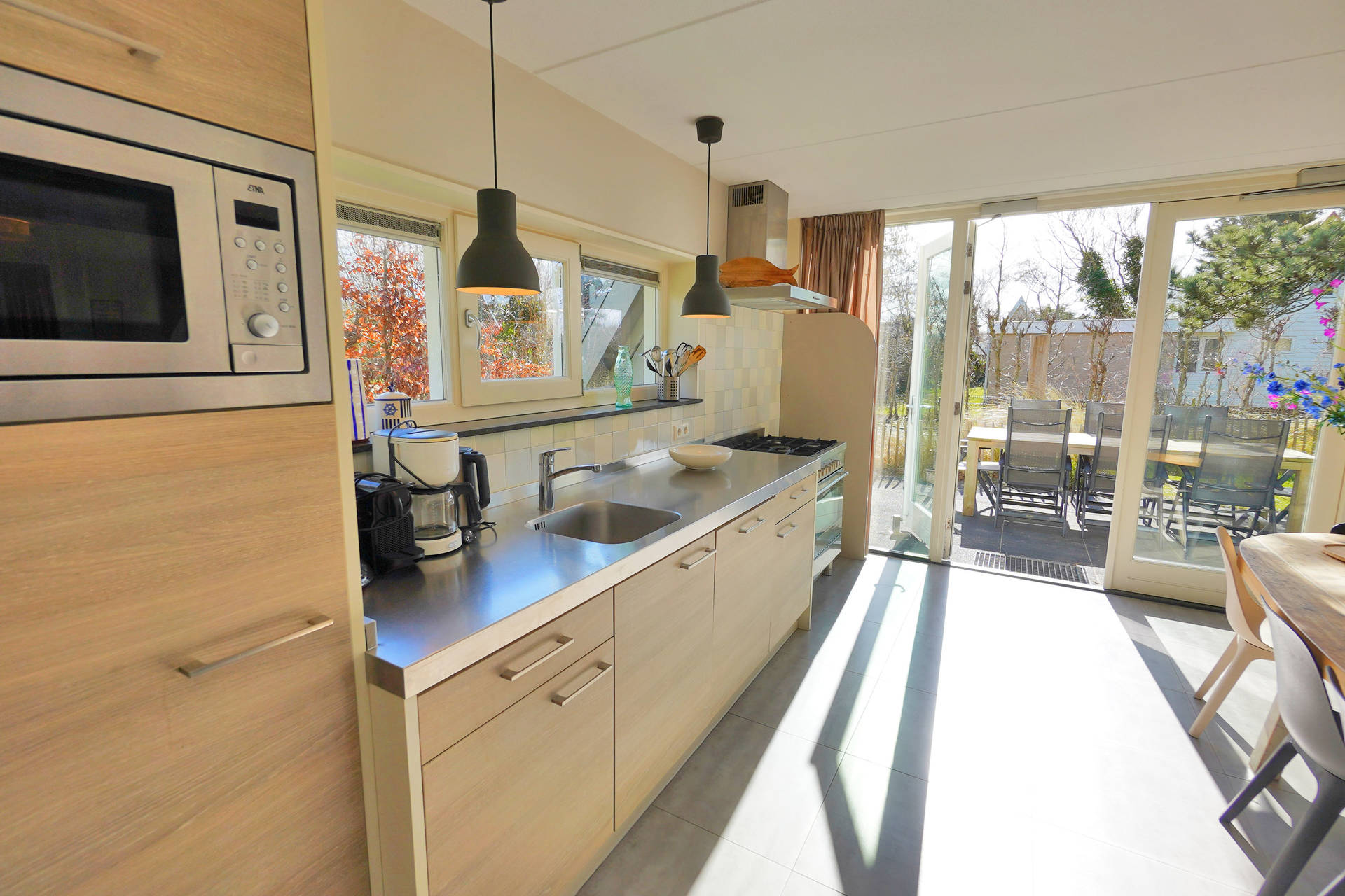 Het huis heeft op de begane grond een mooie, lichte en ruime woonkamer met open keuken. Verder is er op de begane grond een tweepersoonsslaapkamer, badkamer met douche en toilet, en nog een aparte toiletruimte. De open keuken beschikt over een 6 pits fornuis, een vaatwasser, grote oven, combi-magnetron en grote koelkast met vriesvak. De aparte bijkeuken beschikt over een wasmachine en droger.