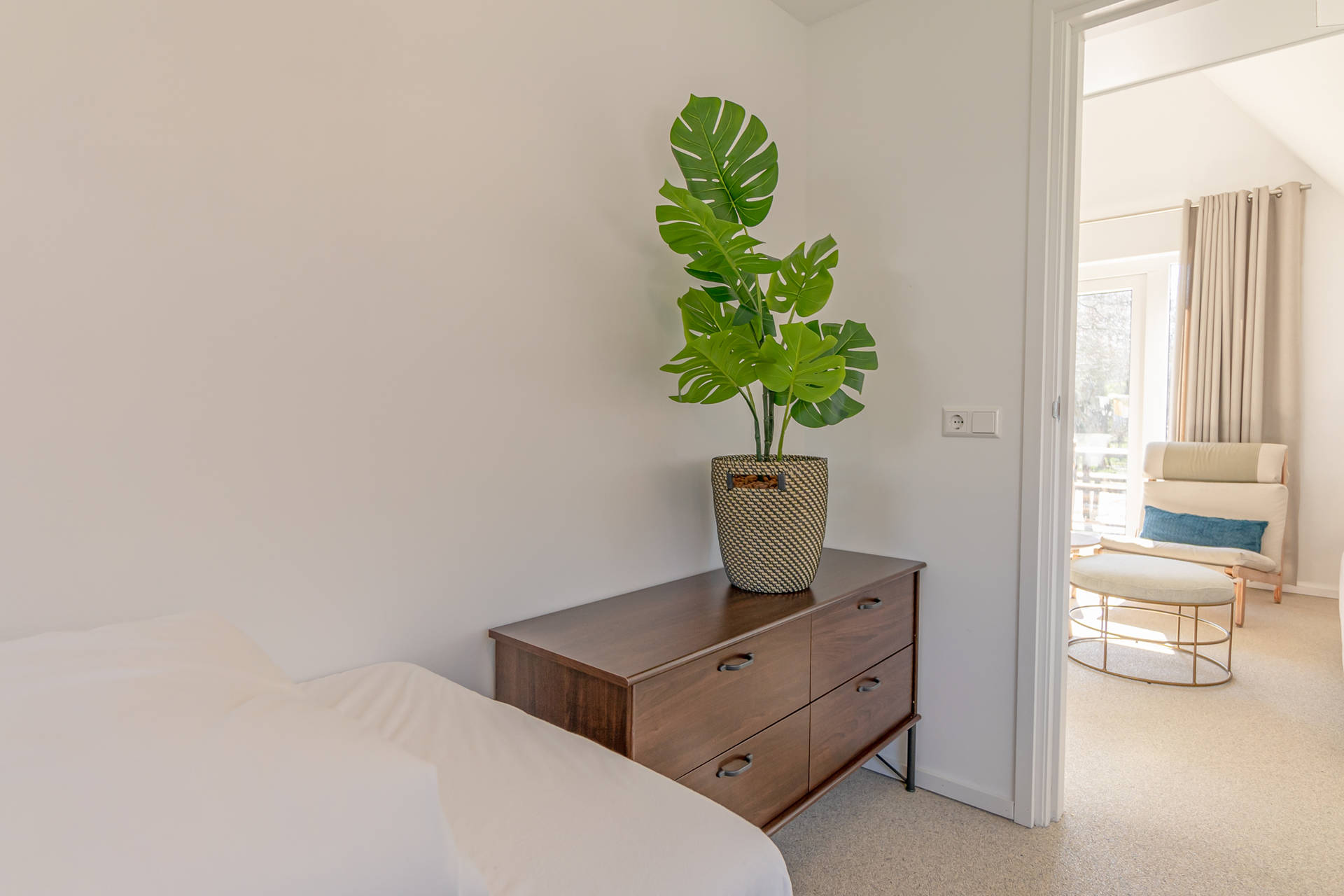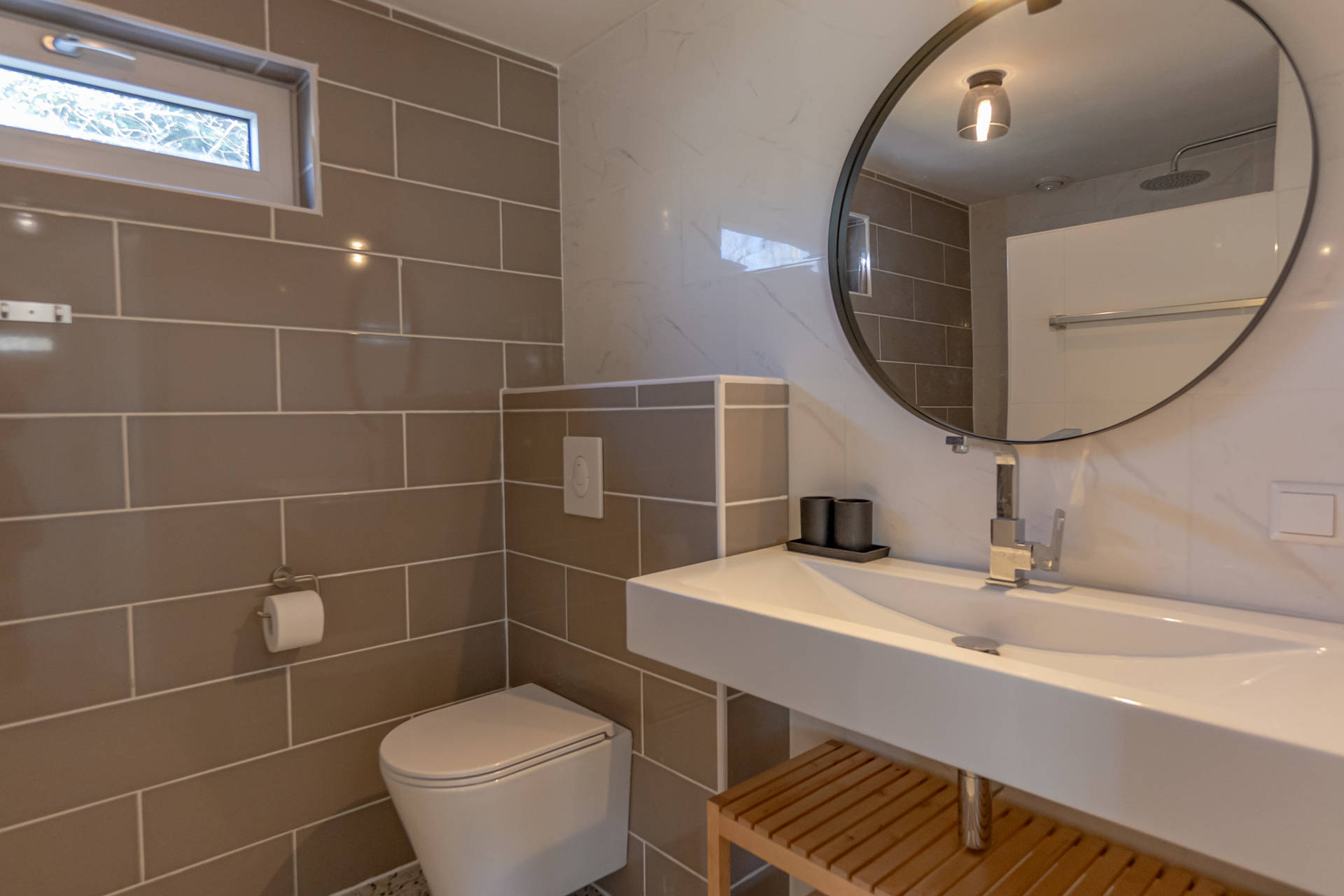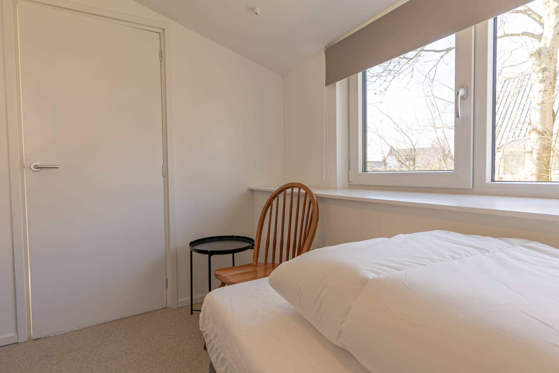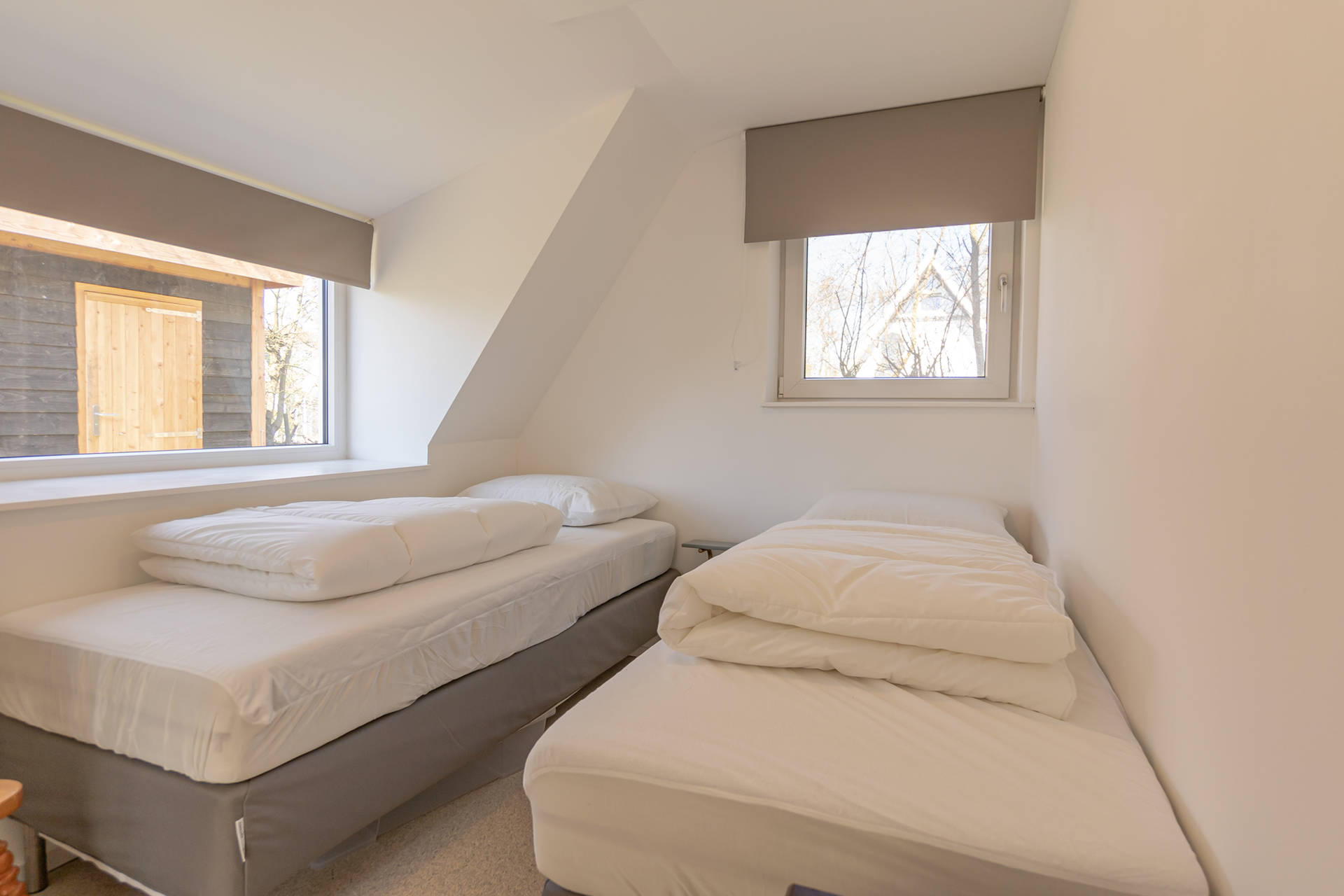 De slaapkamers beschikken elk over 2 eenpersoonsbedden. De badkamer is voorzien van een inloop opbouw regendouche, wastafel en toilet. In de hal is overigens nog een separaat toilet aanwezig. In de berging waar u via buiten kunt komen bevindt zich een wasmachine en droger.