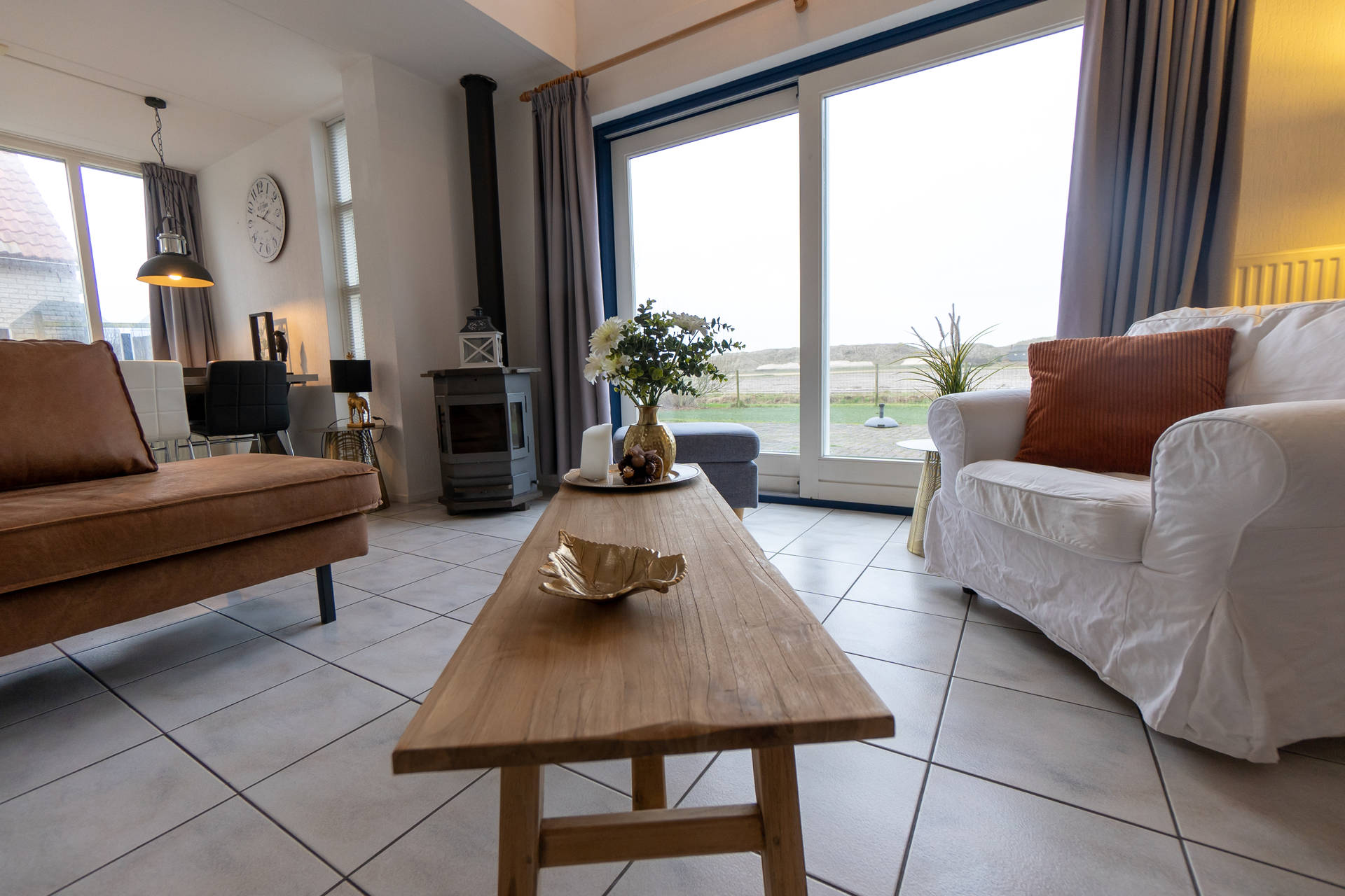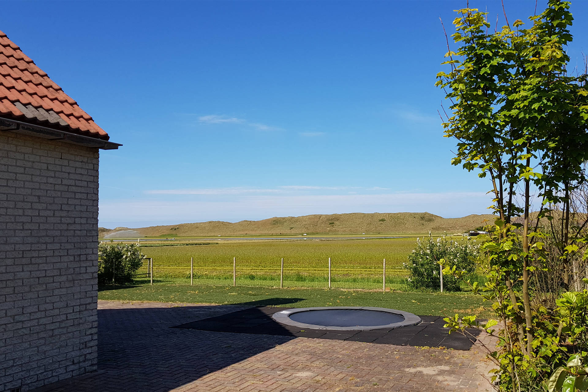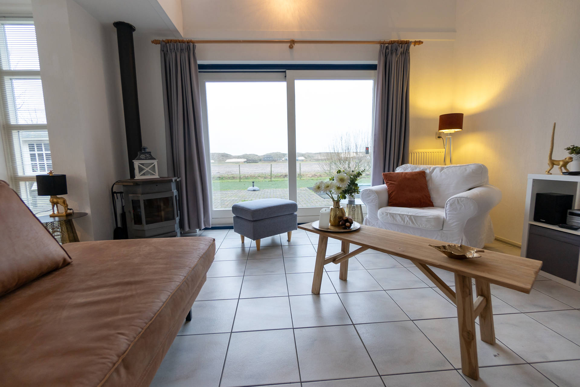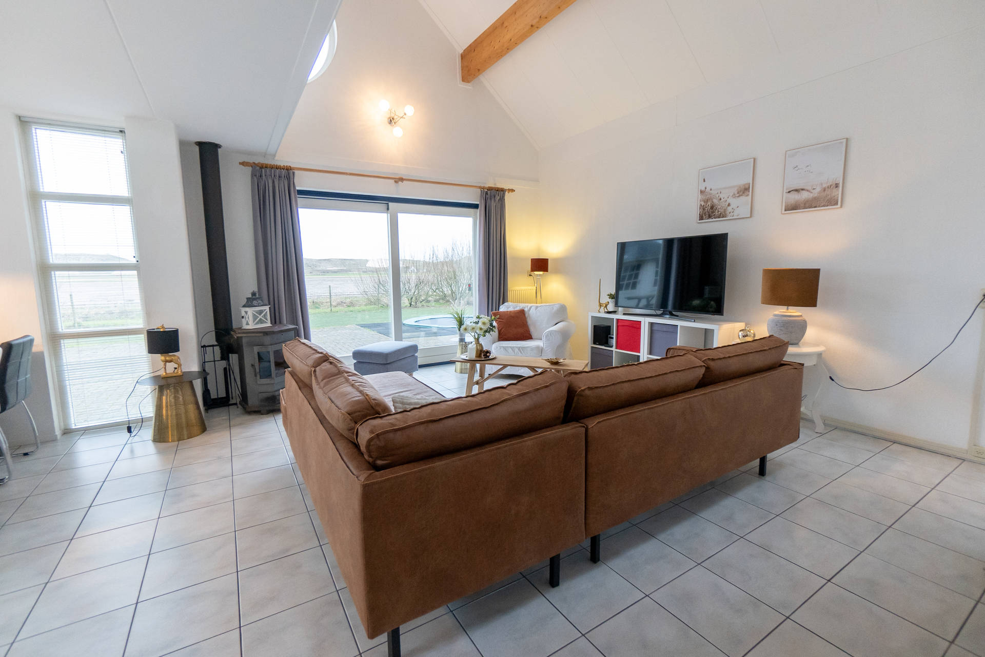Het vakantiehuis heeft een ruime, lichte woonkamer op het zuidwesten met toegang tot het terras met trampoline. Het gebruik van de trampoline is op eigen risico. Er is ook een nieuwe open keuken met combi-oven, vaatwasser, koelkast, koffiezetapparaat, 4-pits gasfornuis. Er is een vriezer in de berging. De villa heeft ook een 2e kleine zithoek in de serre.