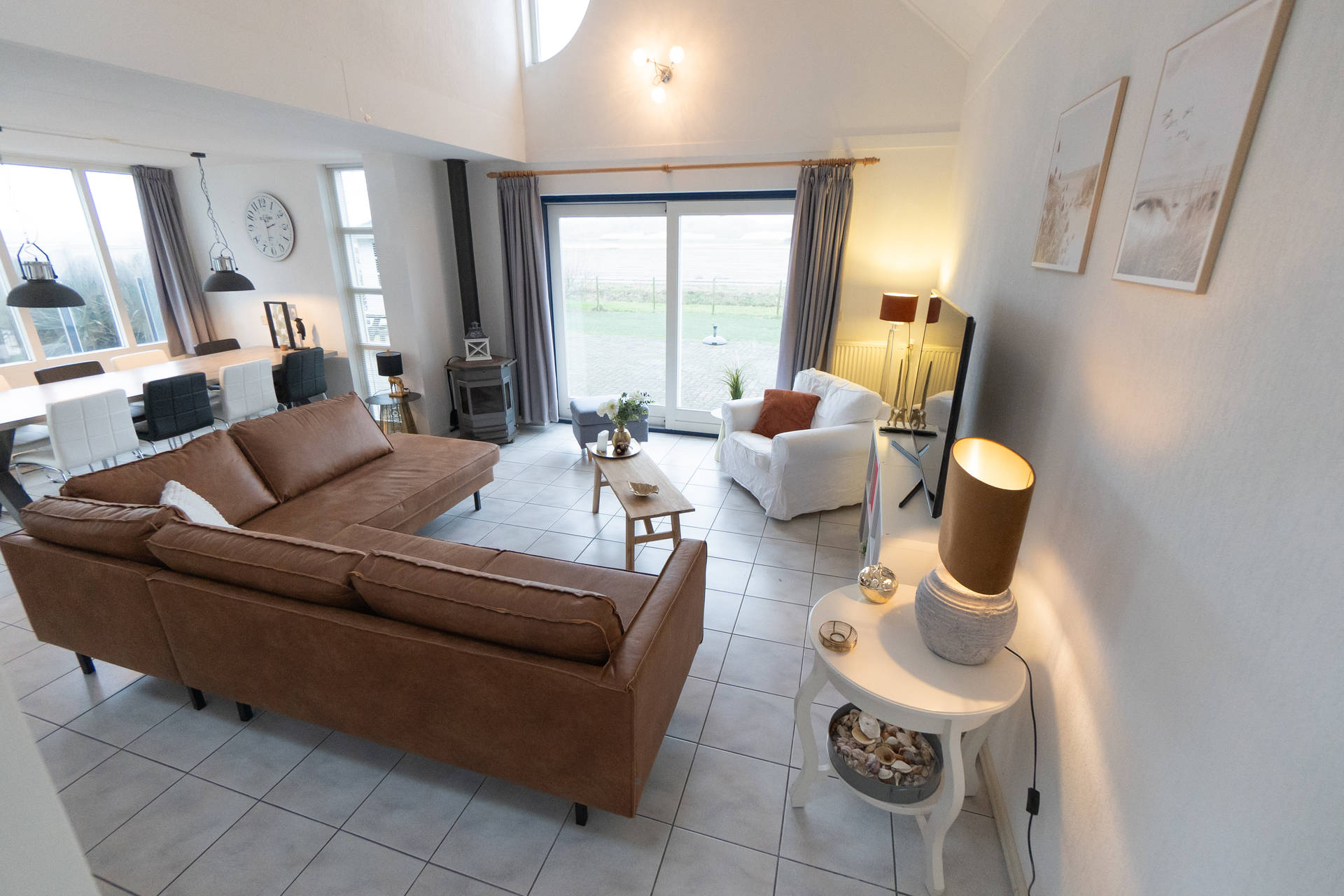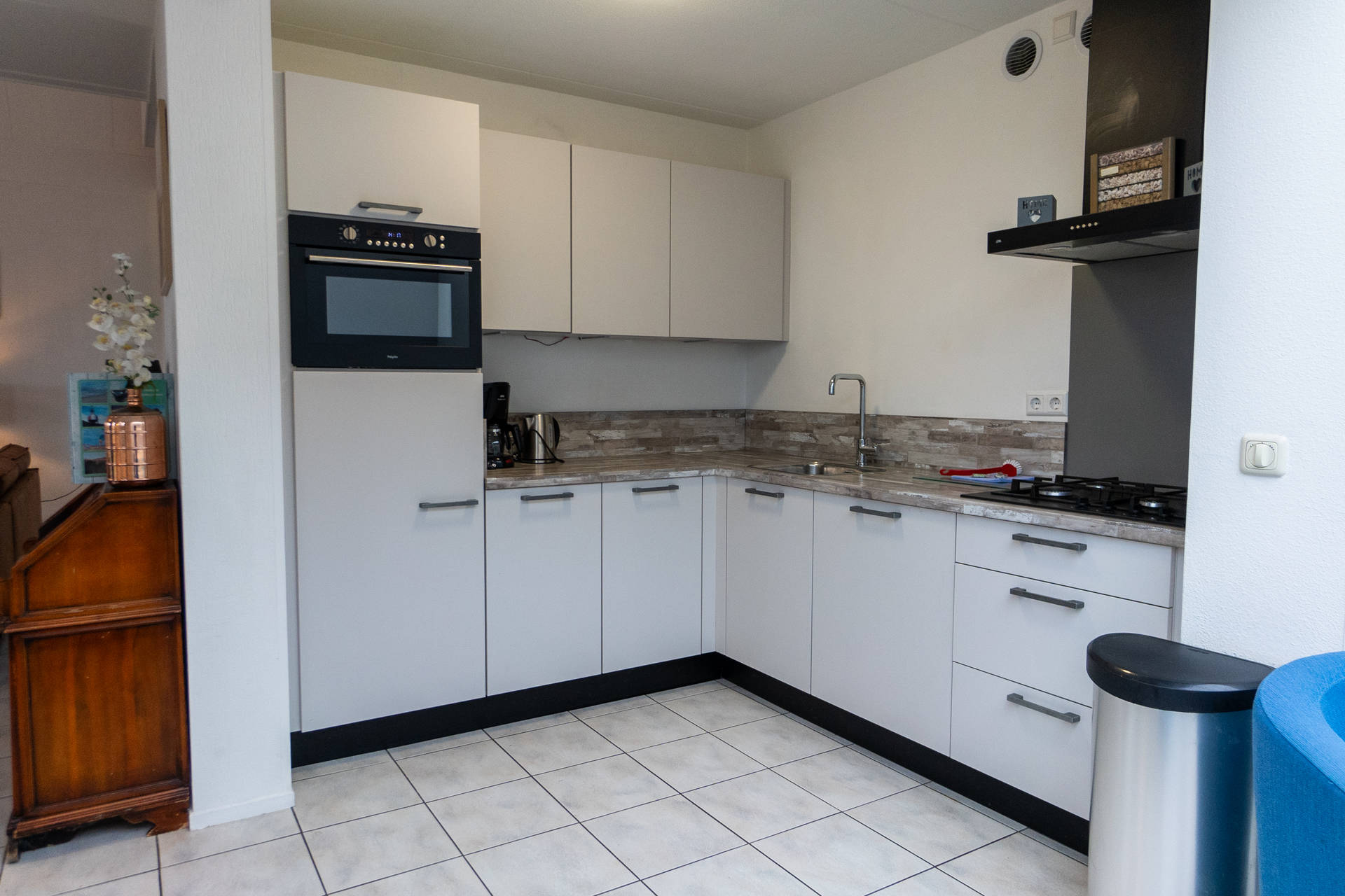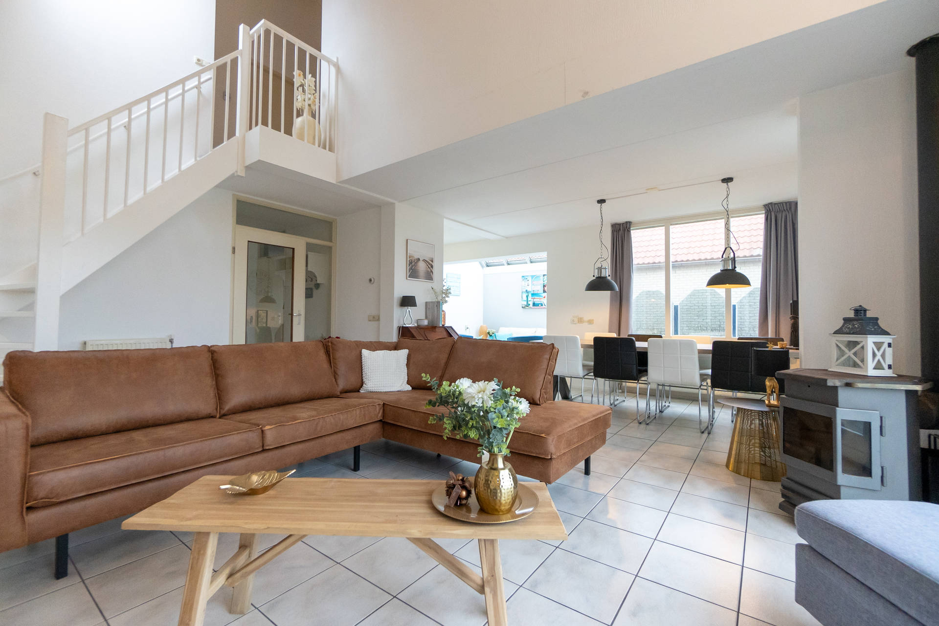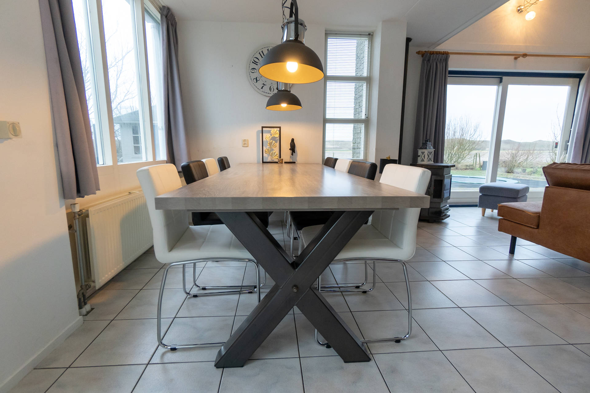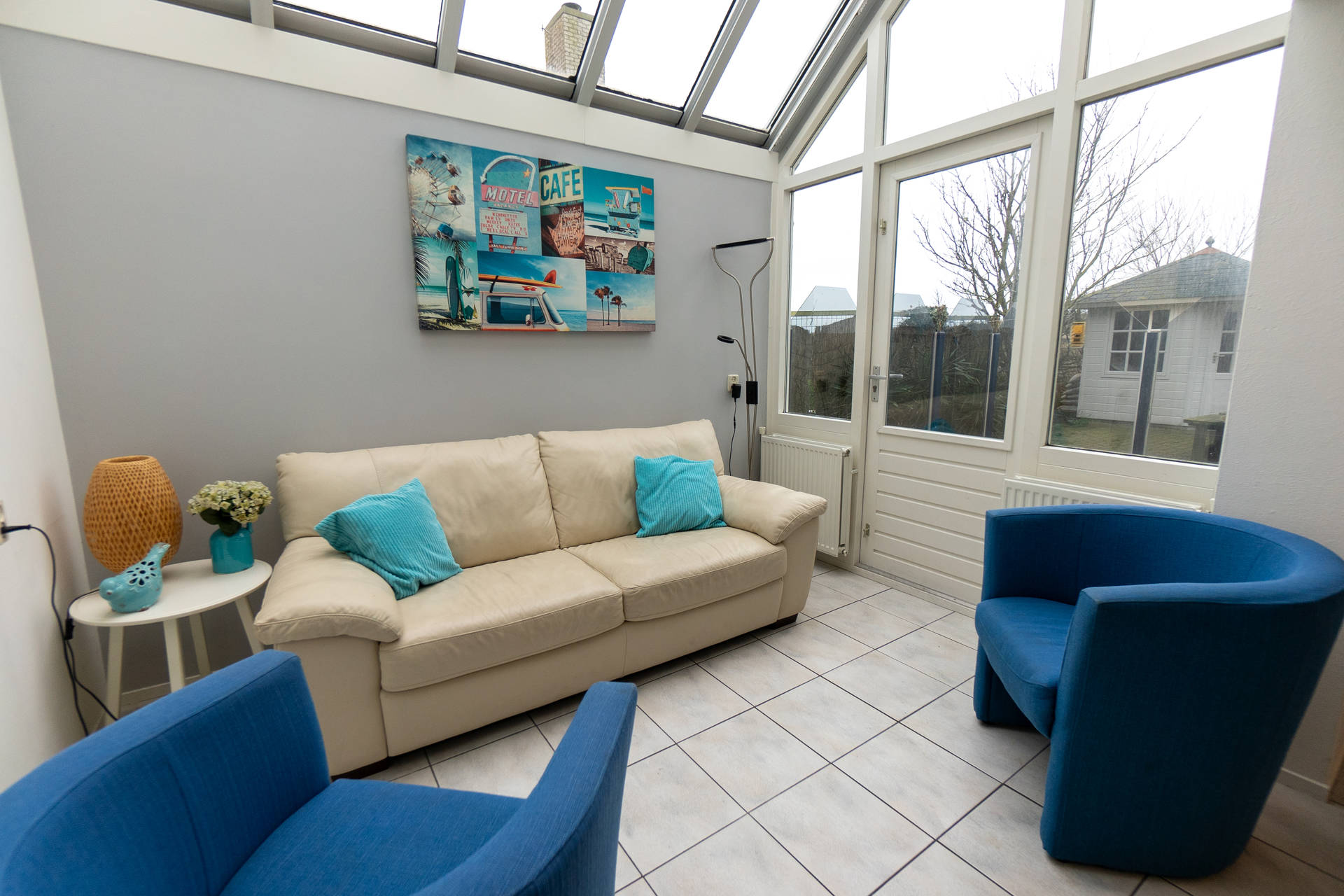 Het vakantiehuis heeft een ruime, lichte woonkamer op het zuidwesten met toegang tot het terras met trampoline. Het gebruik van de trampoline is op eigen risico. Er is ook een nieuwe open keuken met combi-oven, vaatwasser, koelkast, koffiezetapparaat, 4-pits gasfornuis. Er is een vriezer in de berging. De villa heeft ook een 2e kleine zithoek in de serre.