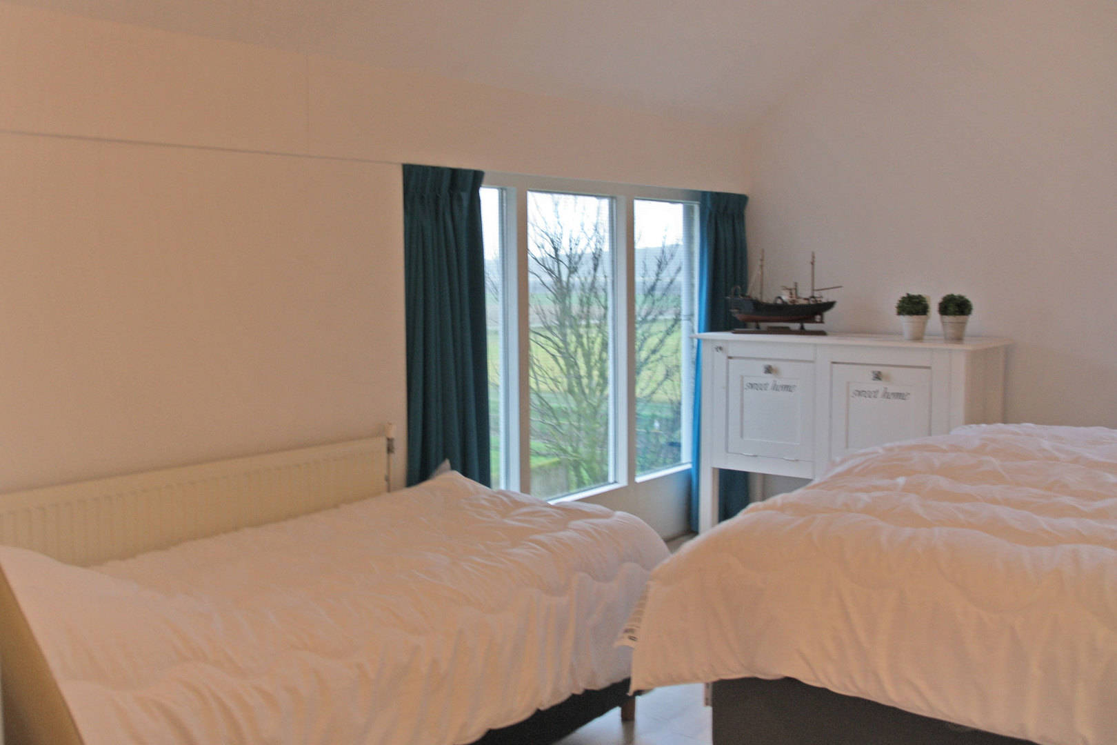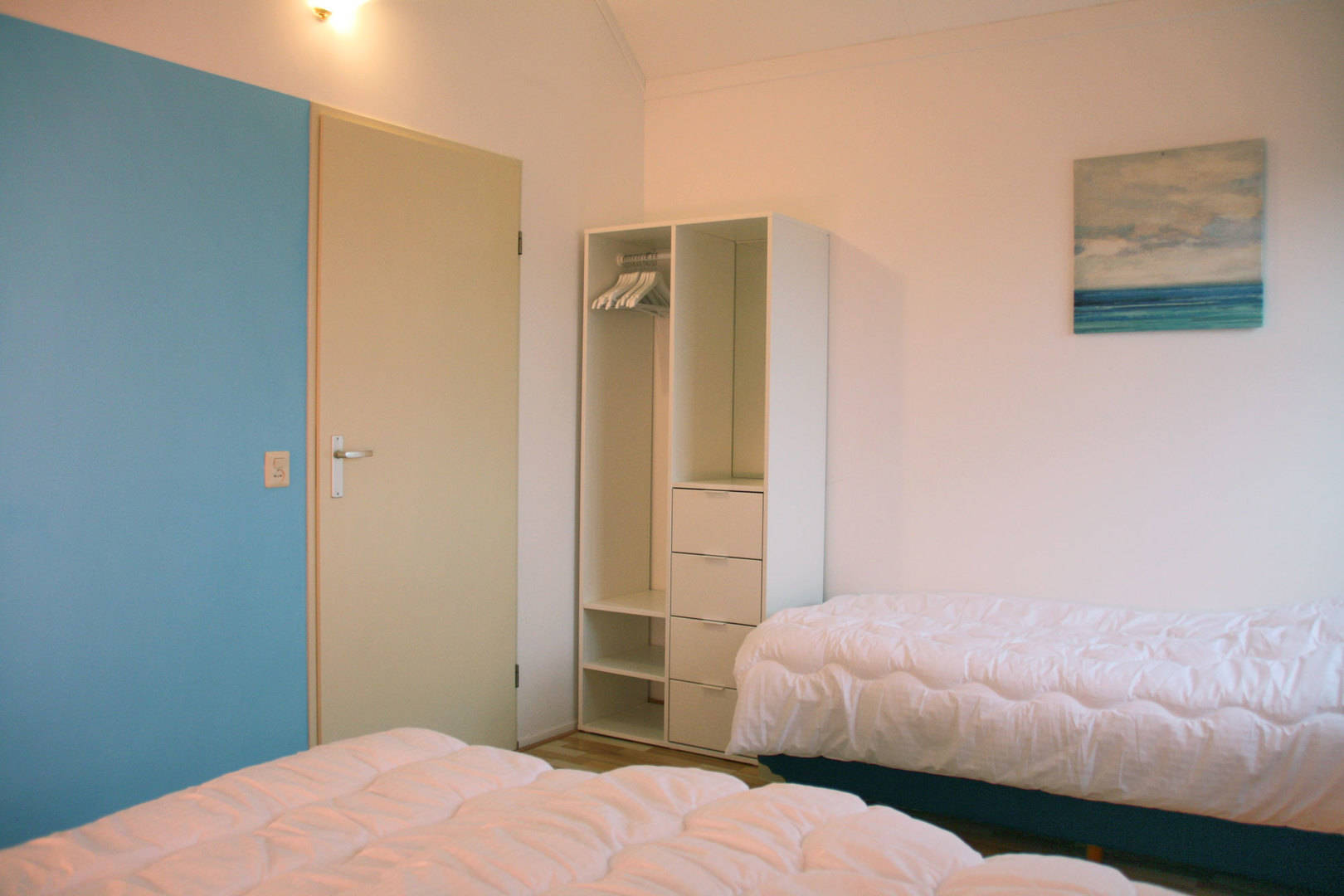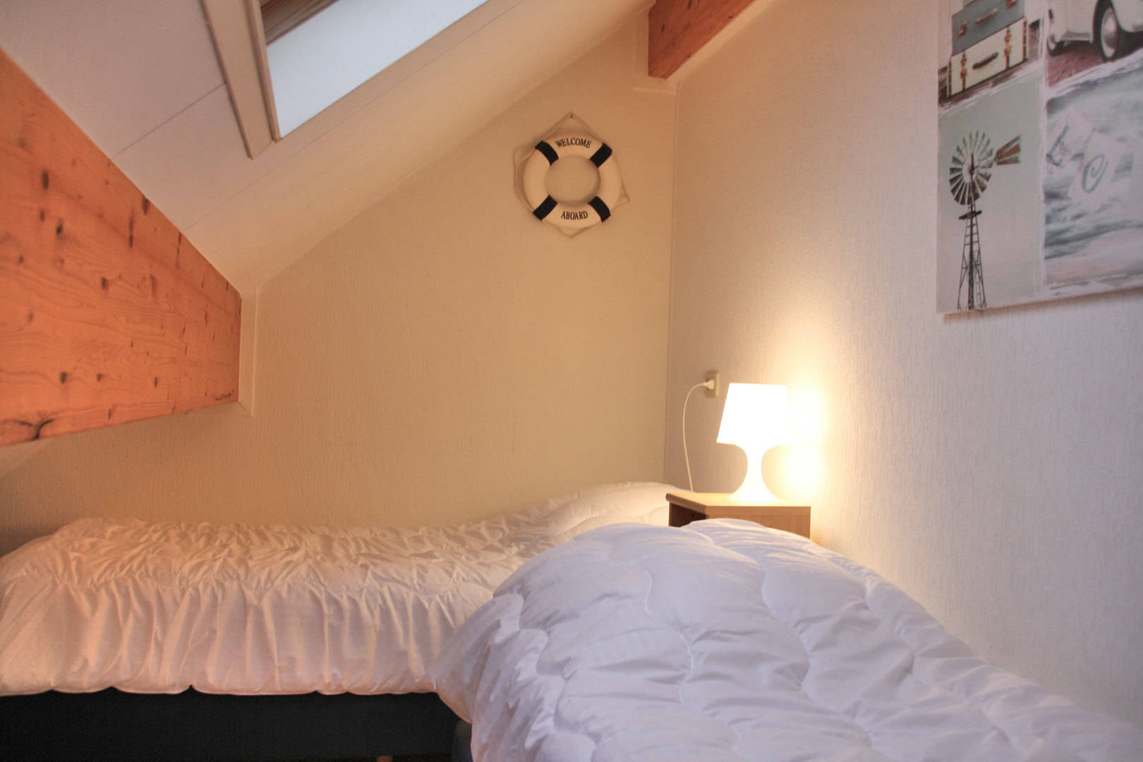 De overige 3 slaapkamers zijn op de 1ste verdieping. Hier zijn 2 slaapkamers met 3 eenpersoons bedden en een wat kleinere slaapkamer met 2 eenspersoons bedden. Op de eerste verdieping is eveneens een kleine badkamer met wc, wasbak en douche. Alle bedden zijn eenpersoons boxspringbedden van 80 bij 200.