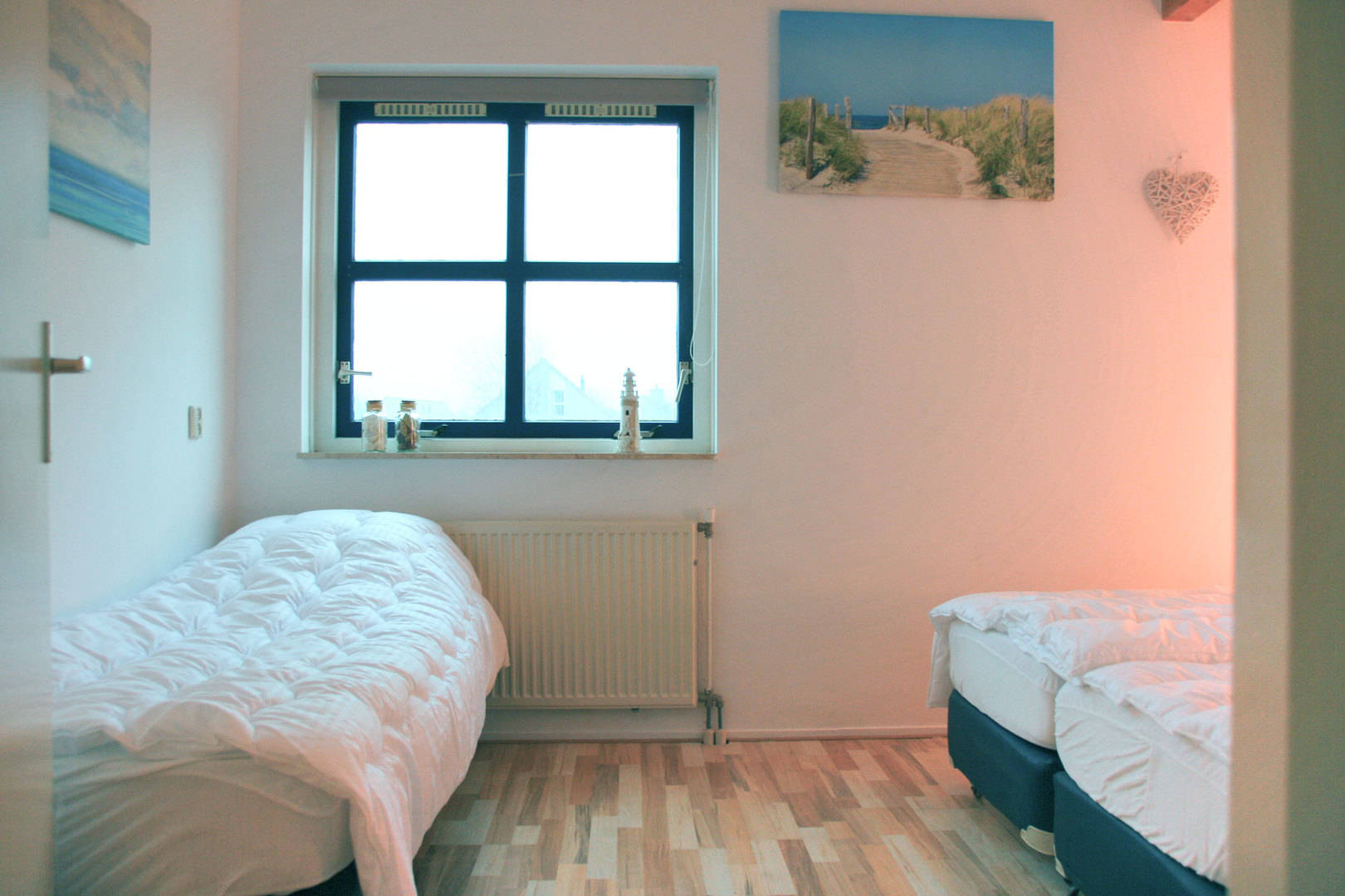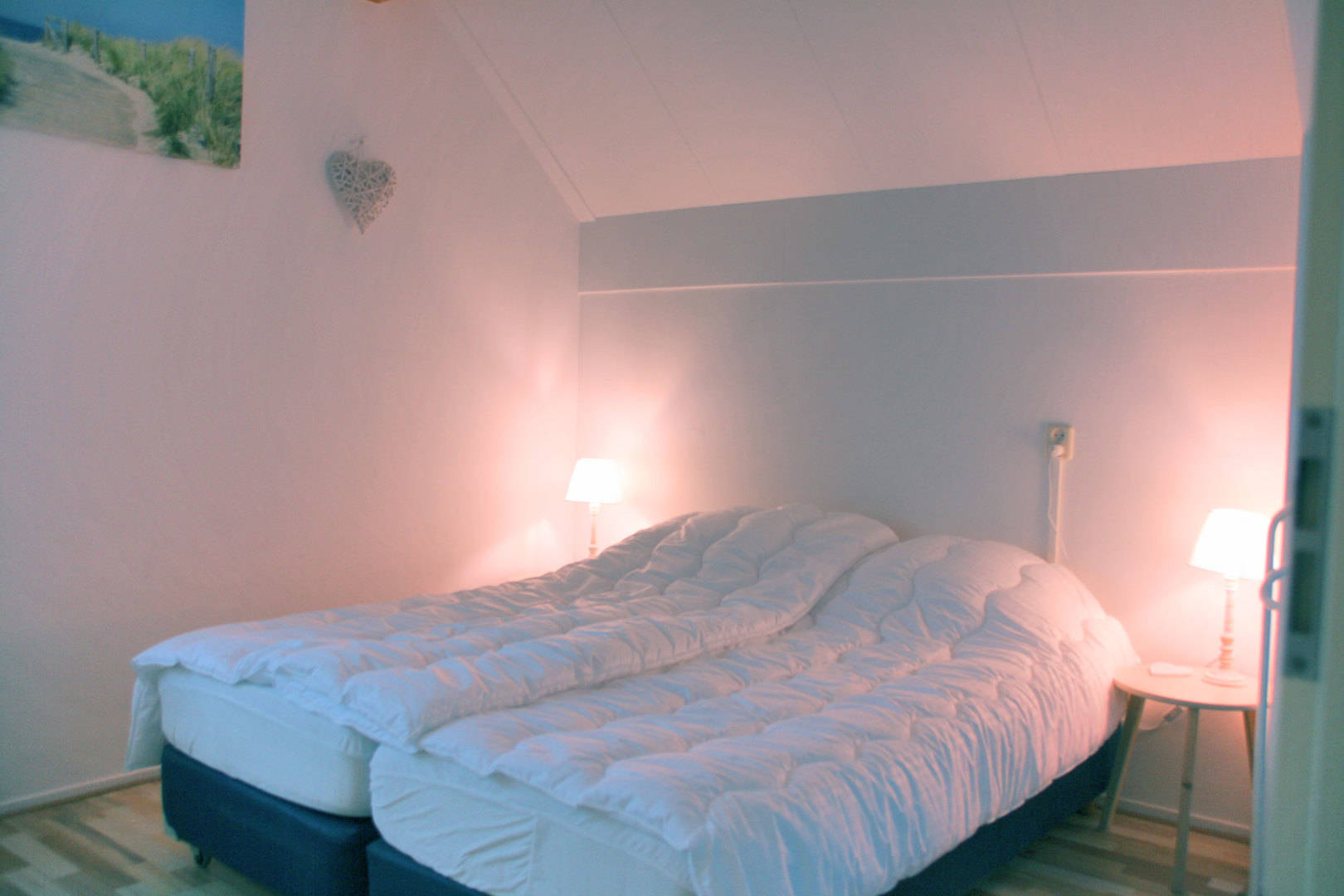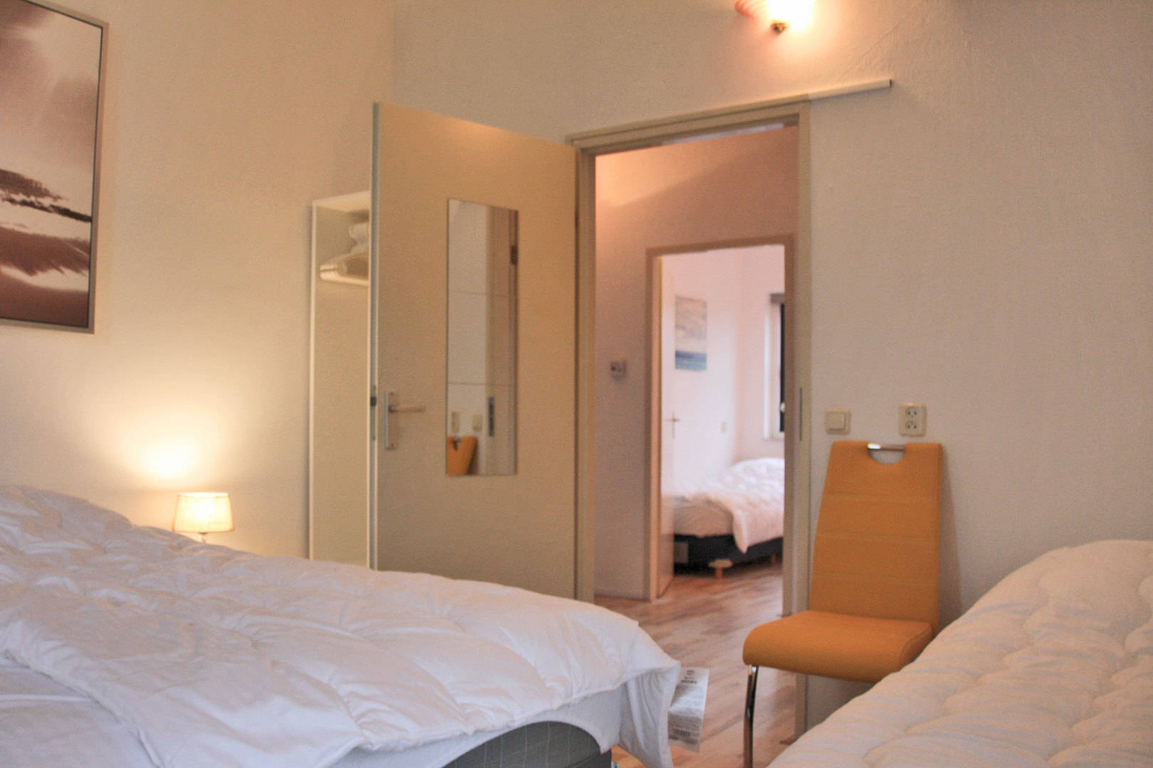 De overige 3 slaapkamers zijn op de 1ste verdieping. Hier zijn 2 slaapkamers met 3 eenpersoons bedden en een wat kleinere slaapkamer met 2 eenspersoons bedden. Op de eerste verdieping is eveneens een kleine badkamer met wc, wasbak en douche. Alle bedden zijn eenpersoons boxspringbedden van 80 bij 200.