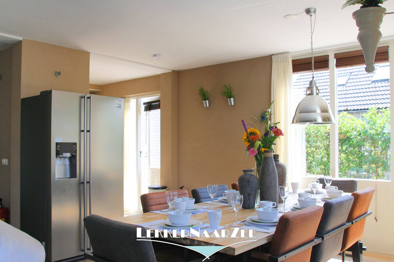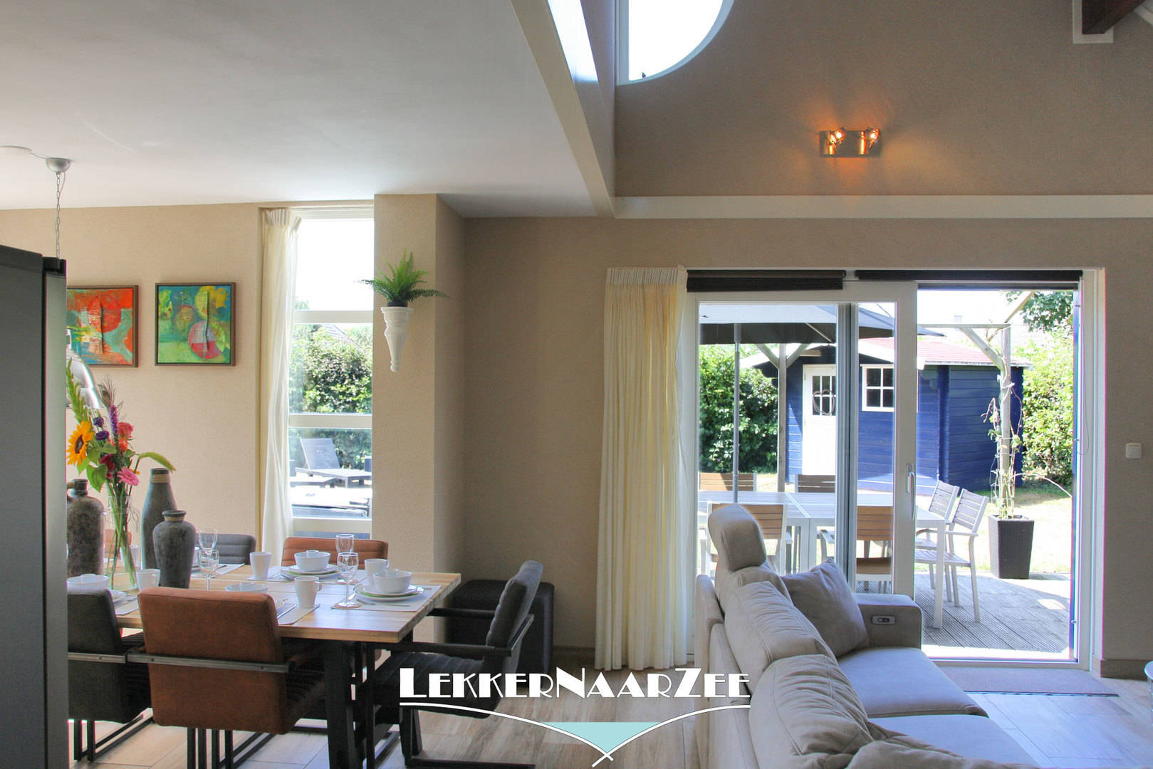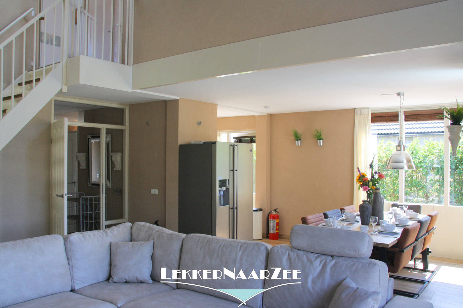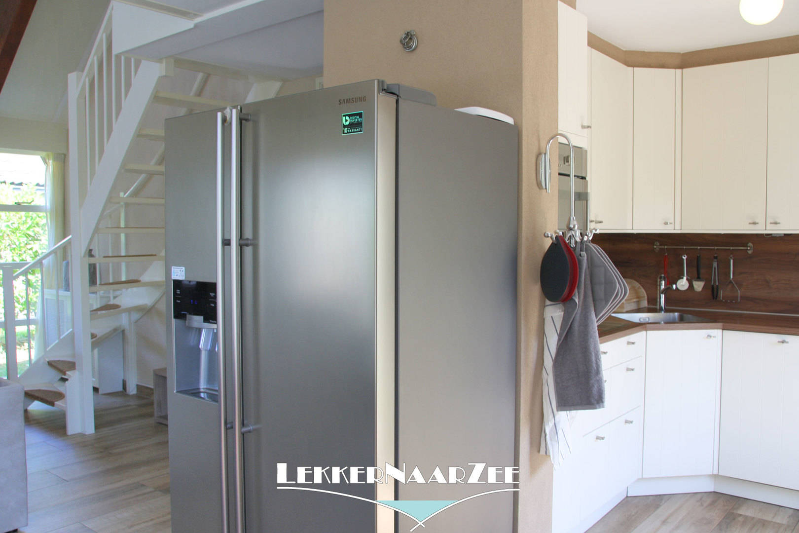 De vakantiewoning beschikt over een heerlijk ruime lichte woonkamer met goed omheinde tuin op het zuid westen. De woonkamer heeft een zeer ruime verstelbare bank en grote tv. Er is een open keuken met 5 pits gasfornuis en een zeer ruime Amerikaanse koelkast met vriesvak. De keuken is verder met vaatwasser, oven, magnetron, koffiezet apparaat en waterkoker van alle gemakken voorzien.