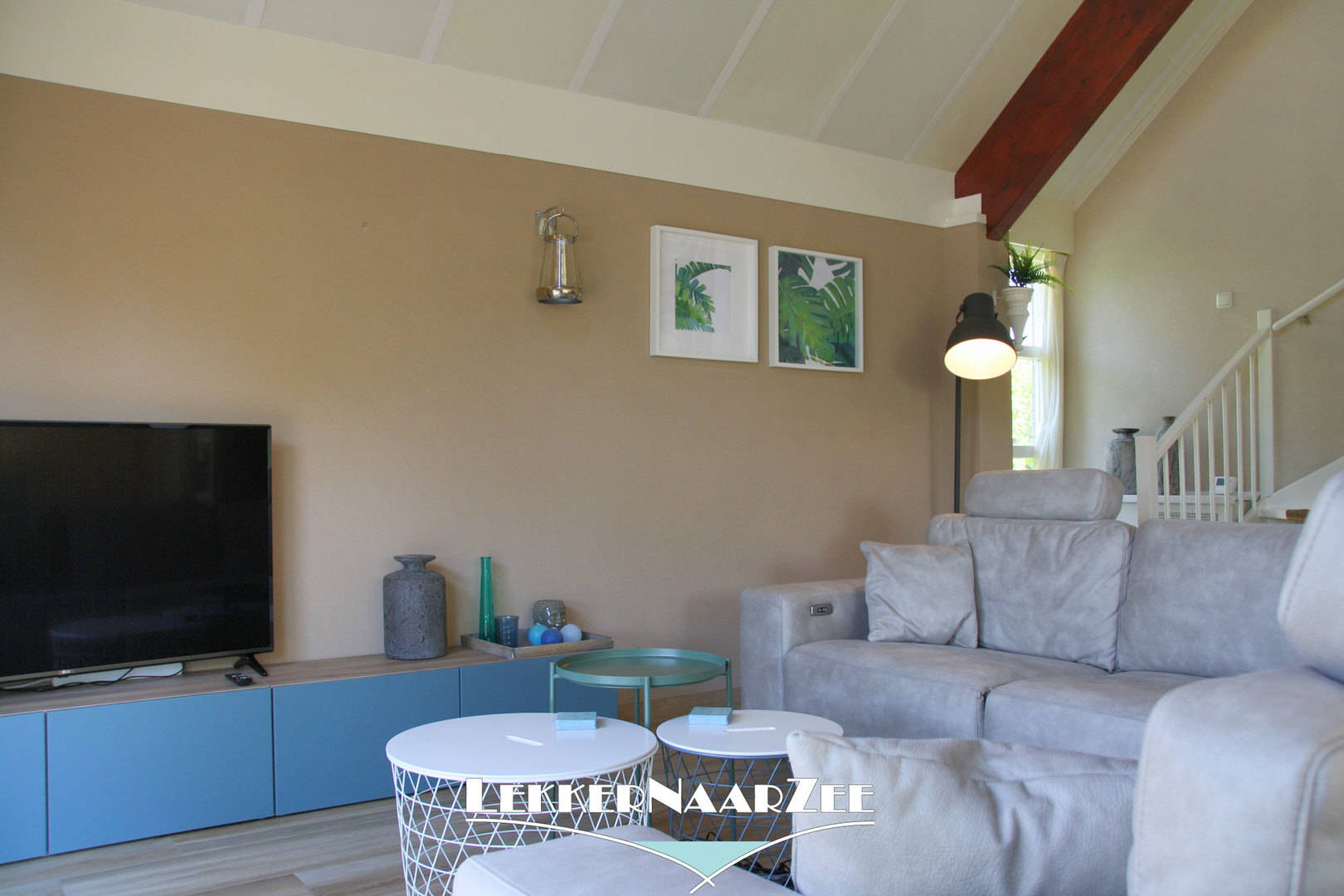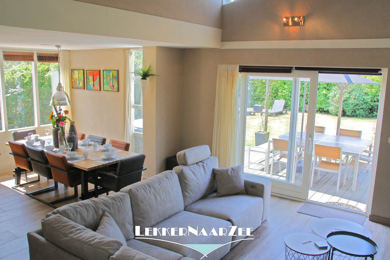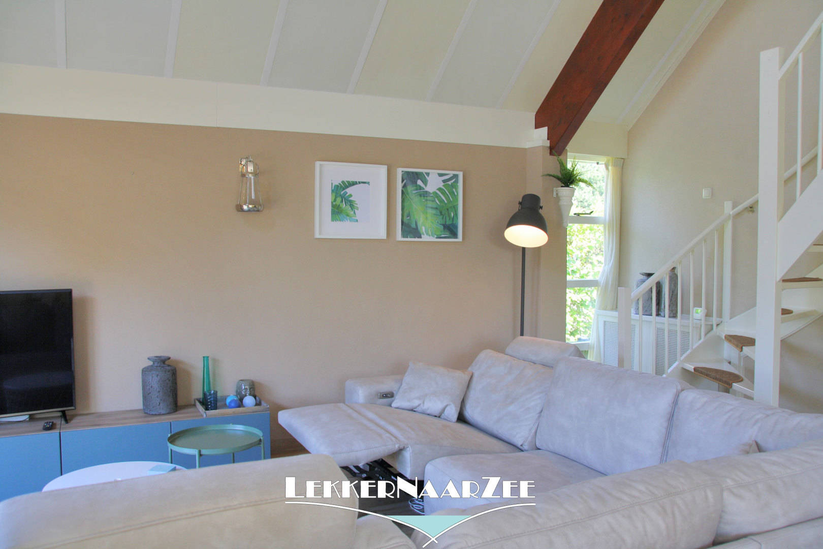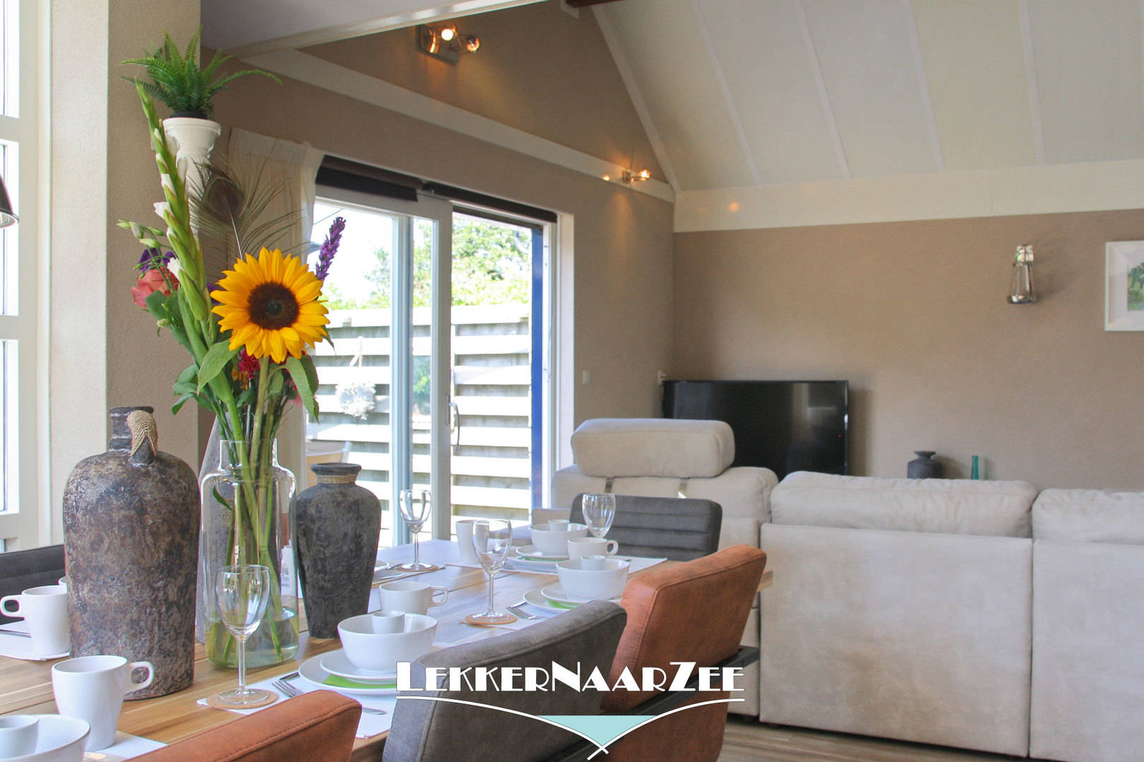 De vakantiewoning beschikt over een heerlijk ruime lichte woonkamer met goed omheinde tuin op het zuid westen. De woonkamer heeft een zeer ruime verstelbare bank en grote tv. Er is een open keuken met 5 pits gasfornuis en een zeer ruime Amerikaanse koelkast met vriesvak. De keuken is verder met vaatwasser, oven, magnetron, koffiezet apparaat en waterkoker van alle gemakken voorzien.